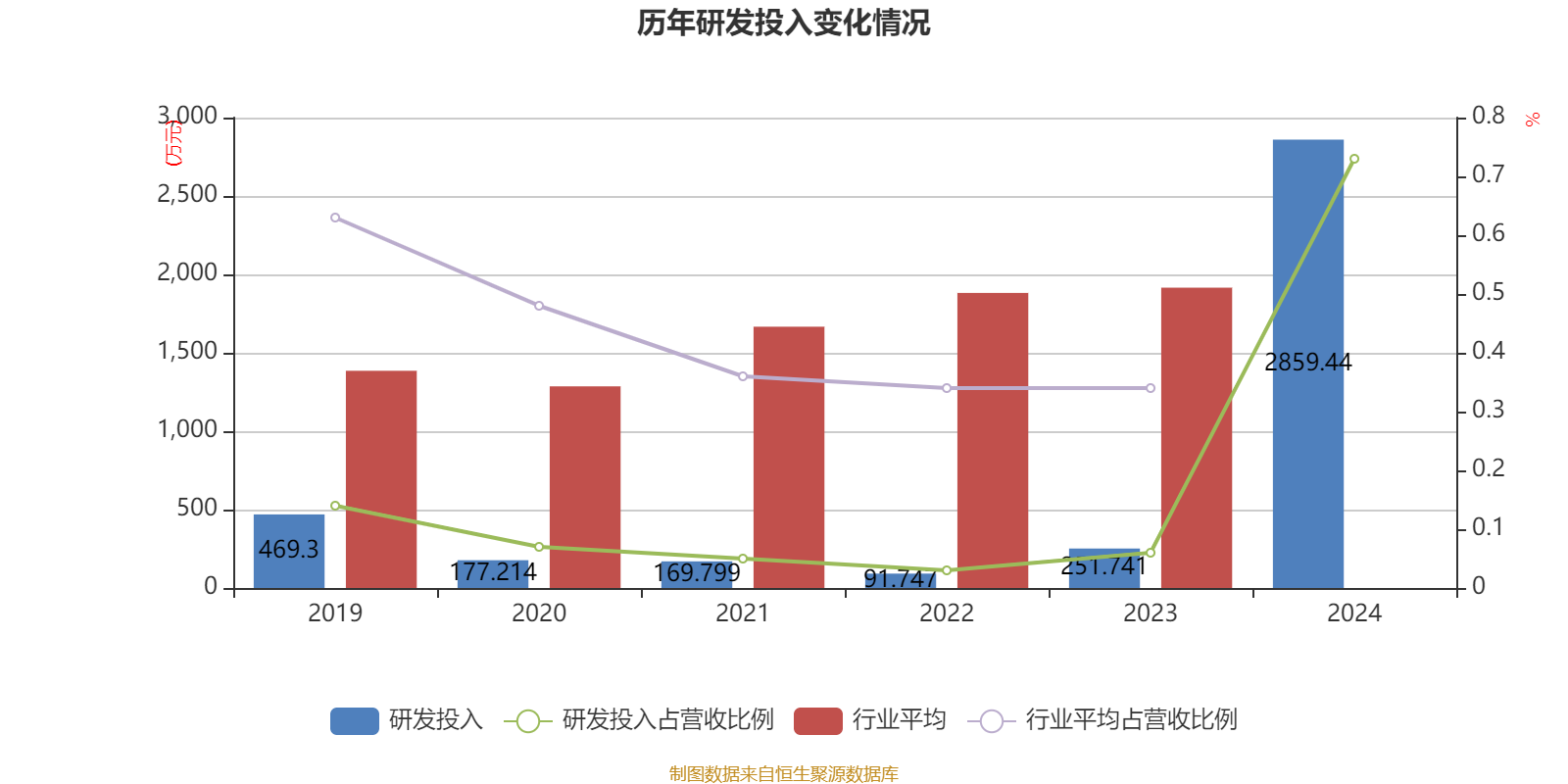2024年全年,公司研发投入金额为2859.44万元,同比增长1035.86%;研发投入占营业收入比例为0.73%,相比上年同期上升0.67个百分点。此外,公司全年研发投入资本化率为0%。