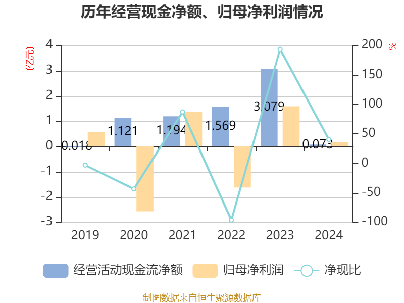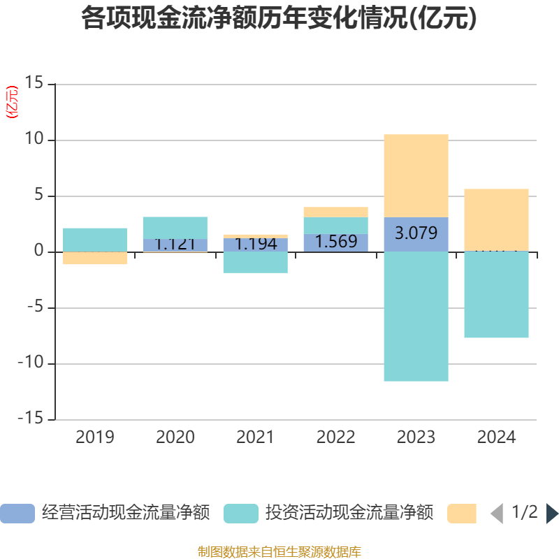 截至2024年,公司经营活动现金流净额为725.83万元,同比下降97.64%;筹资活动现金流净额5.53亿元,同比减少1.88亿元;投资活动现金流净额-7.7亿元,上年同期为-11.6亿元。