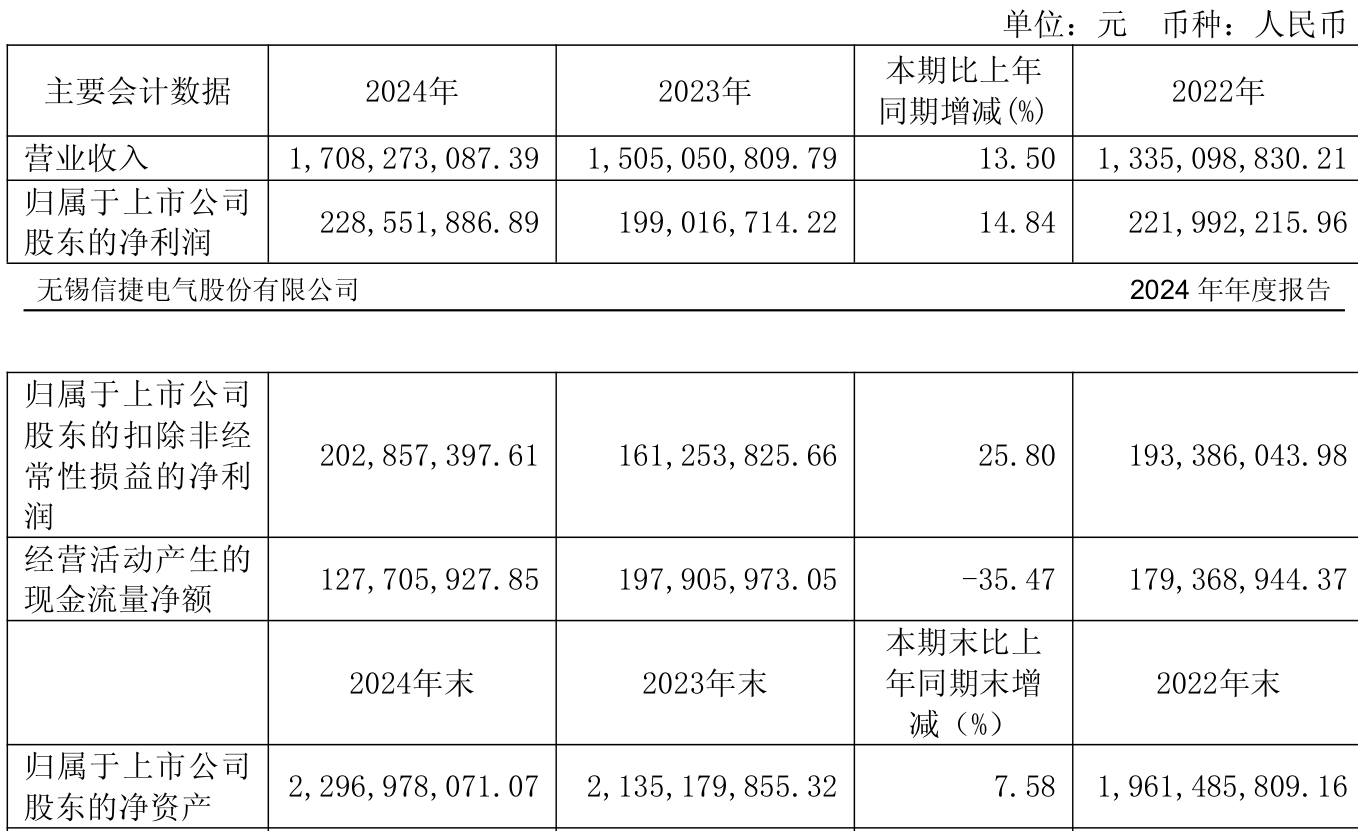 中证智能财讯信捷电气(603416)4月26日披露2024年年度报告。2024年,公司实现营业总收入17.08亿元,同比增长13.50%;归母净利润2.29亿元,同比增长14.84%;扣非净利润2.03亿元,同比增长25.80%;经营活动产生的现金流量净额为1.28亿元,同比下降35.47%;报告期内,信捷电气基本每股收益为1.64元,加权平均净资产收益率为10.36%。公司2024年度分配预案为:拟向全体股东每10股派现8.7元(含税)。