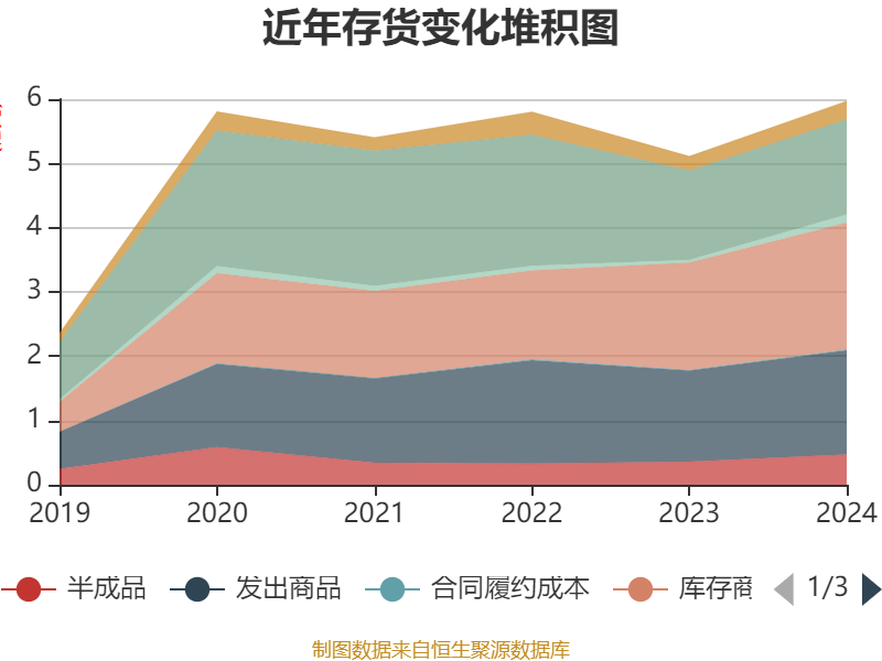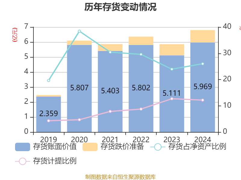 从存货变动来看,截至2024年末,公司存货账面价值为5.97亿元,占净资产的25.99%,较上年末增加8580.42万元。其中,存货跌价准备为8254.68万元,计提比例为12.15%。