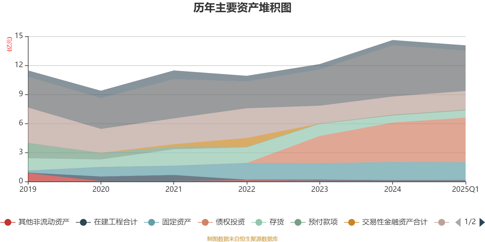 资产重大变化方面,截至2025年一季度末,公司货币资金较上年末减少21.3%,占公司总资产比重下降6.62个百分点;债权投资较上年末增加12.88%,占公司总资产比重上升4.81个百分点;应收票据及应收账款较上年末增加3.06%,占公司总资产比重上升0.91个百分点;存货较上年末增加3.3%,占公司总资产比重上升0.36个百分点。
