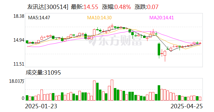 中证智能财讯友讯达(300514)4月28日披露2025年第一季度报告。公司实现营业总收入1.34亿元,同比下降29.30%;归母净利润879.9万元,同比下降70.63%;扣非净利润631.58万元,同比下降77.47%;经营活动产生的现金流量净额为-5485.3万元,上年同期为-3629.16万元;报告期内,友讯达基本每股收益为0.044元,加权平均净资产收益率为0.84%。
