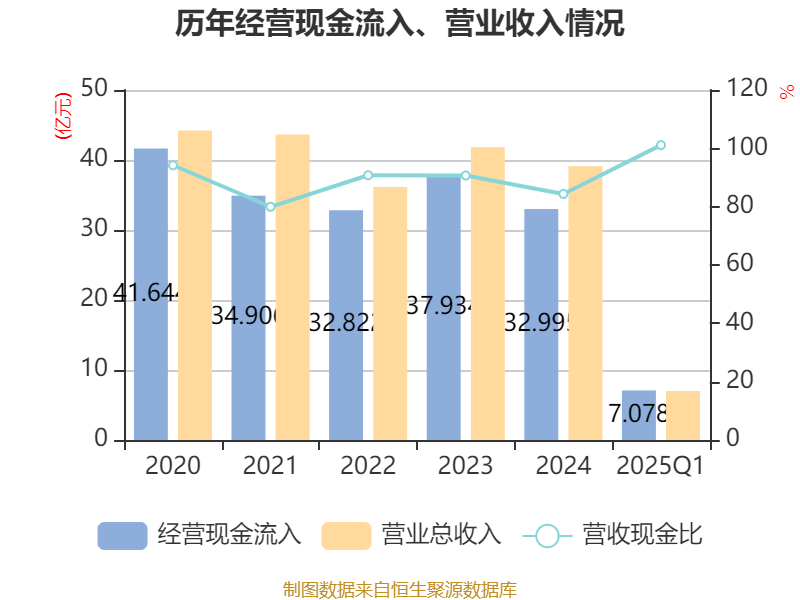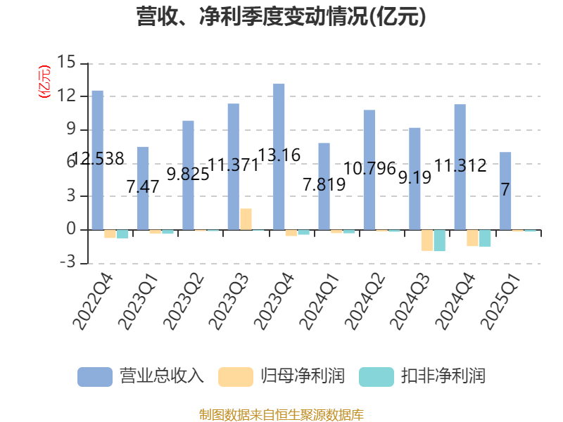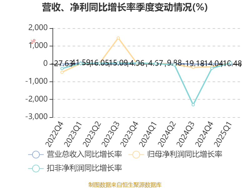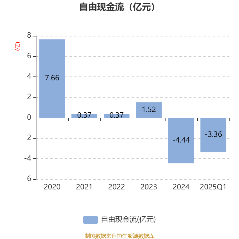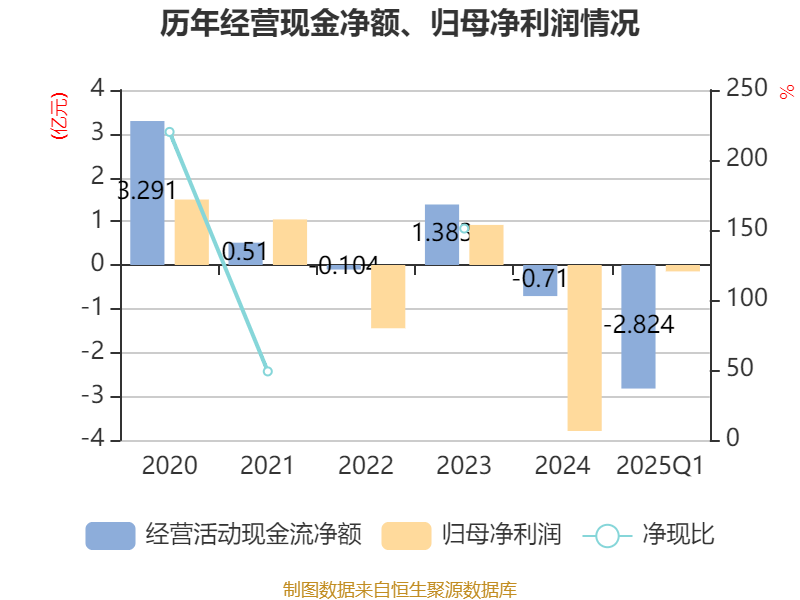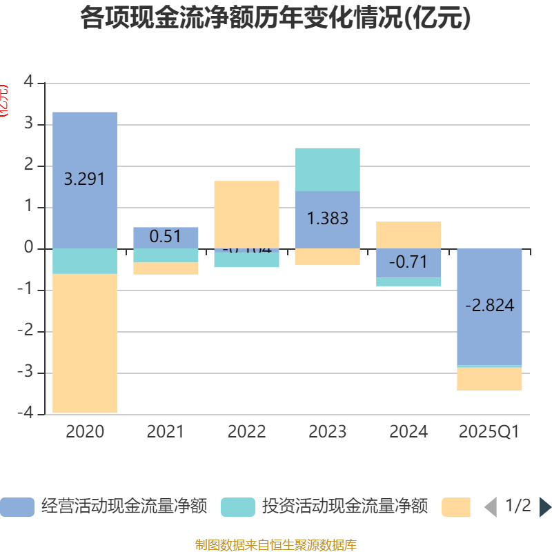 截至2025年一季度末,公司经营活动现金流净额为-2.82亿元,同比增加6851.79万元;筹资活动现金流净额-5520.4万元,同比减少1.27亿元;投资活动现金流净额-560.87万元,上年同期为-407.07万元。
