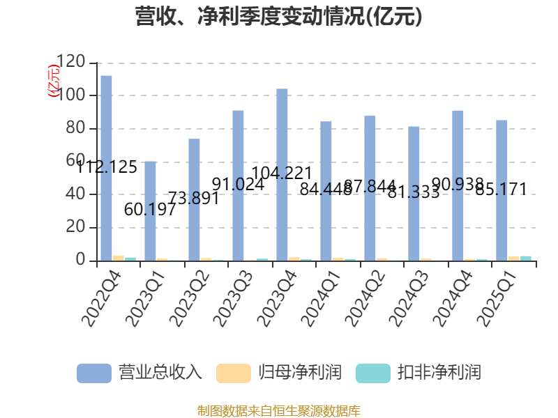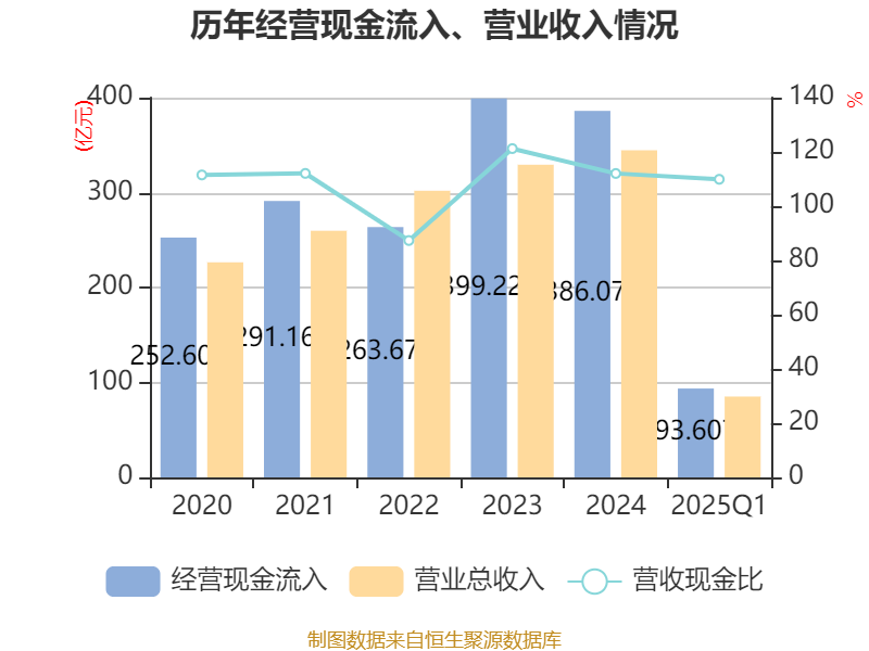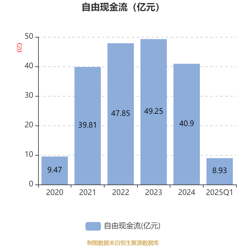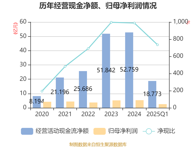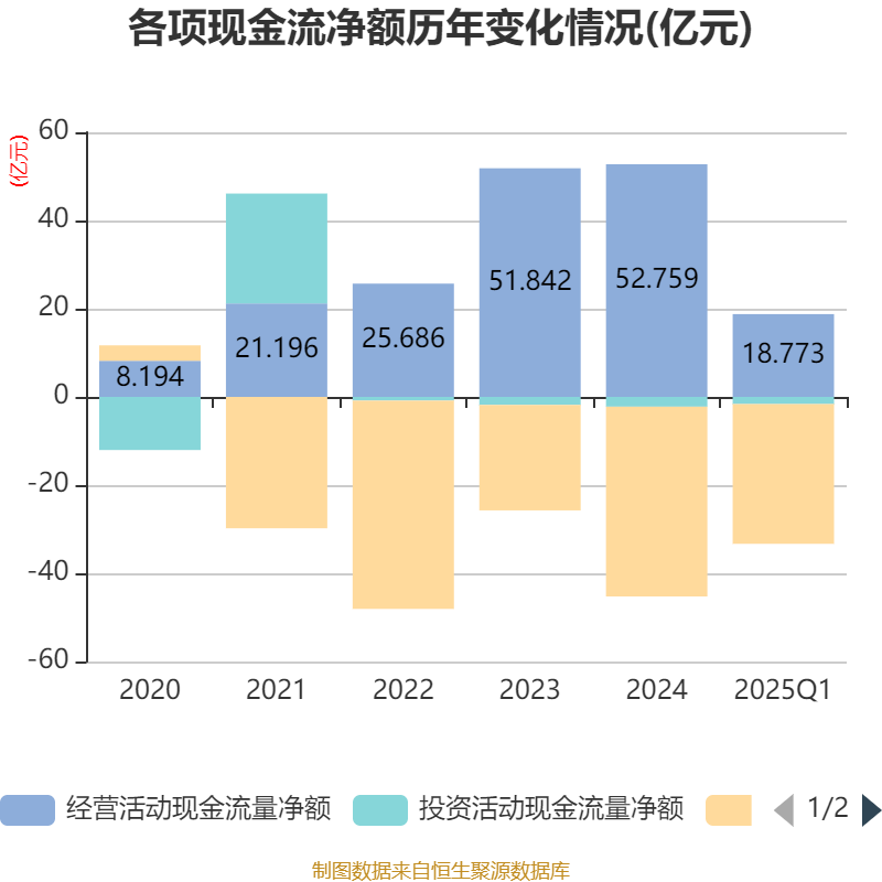 截至2025年一季度末,公司经营活动现金流净额为18.77亿元,同比增长957.68%;筹资活动现金流净额-31.69亿元,同比减少24.69亿元;投资活动现金流净额-1.62亿元,上年同期为1.5亿元。