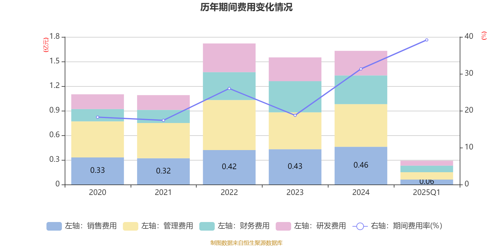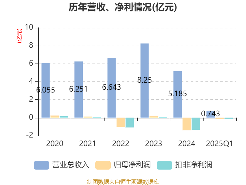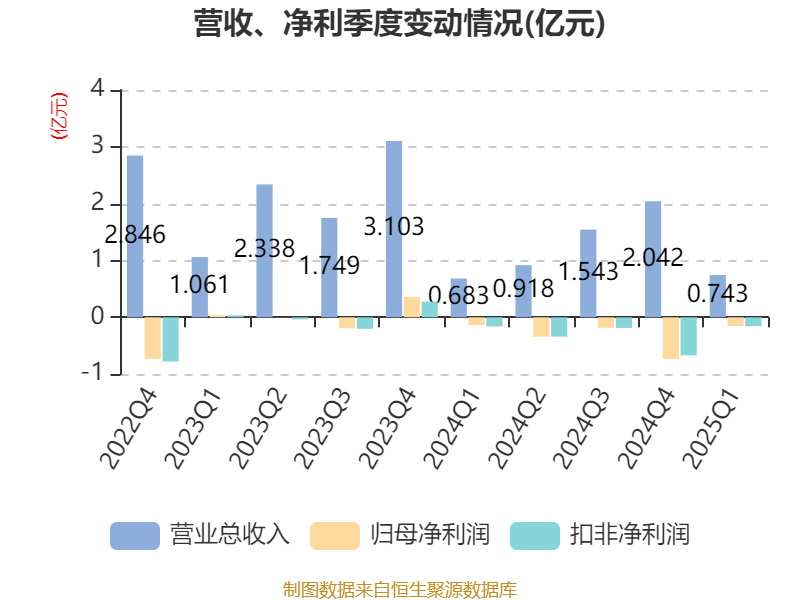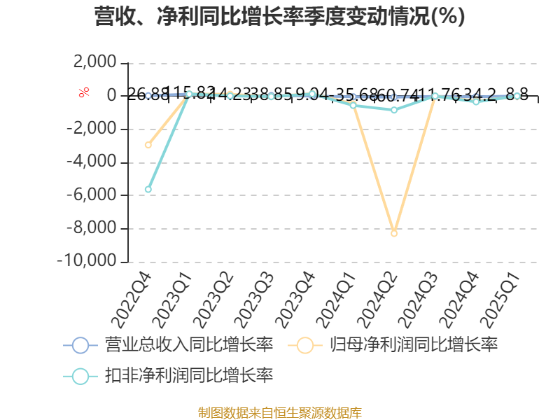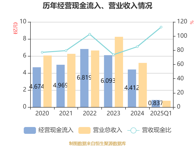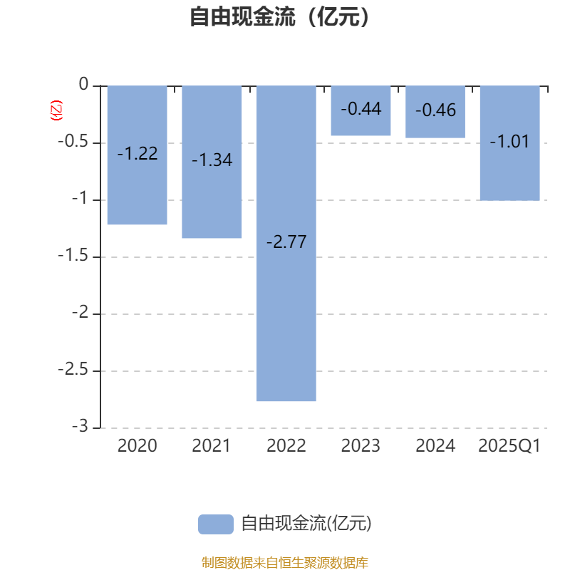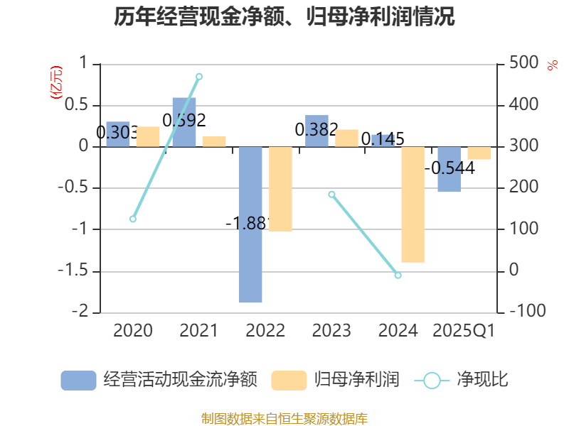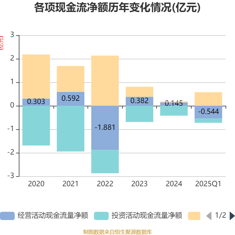 截至2025年一季度末,公司经营活动现金流净额为-5441.54万元,同比减少1058.06万元;筹资活动现金流净额5758万元,同比增加4018.64万元;投资活动现金流净额-1797.18万元,上年同期为-2498.14万元。