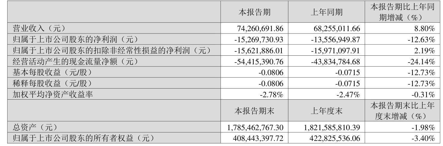中证智能财讯飞鹿股份(300665)4月28日披露2025年第一季度报告。公司实现营业总收入7426.07万元,同比增长8.80%;归母净利润亏损1526.97万元,上年同期亏损1355.69万元;扣非净利润亏损1562.19万元,上年同期亏损1597.11万元;经营活动产生的现金流量净额为-5441.54万元,上年同期为-4383.48万元;报告期内,飞鹿股份基本每股收益为-0.0806元,加权平均净资产收益率为-2.78%。