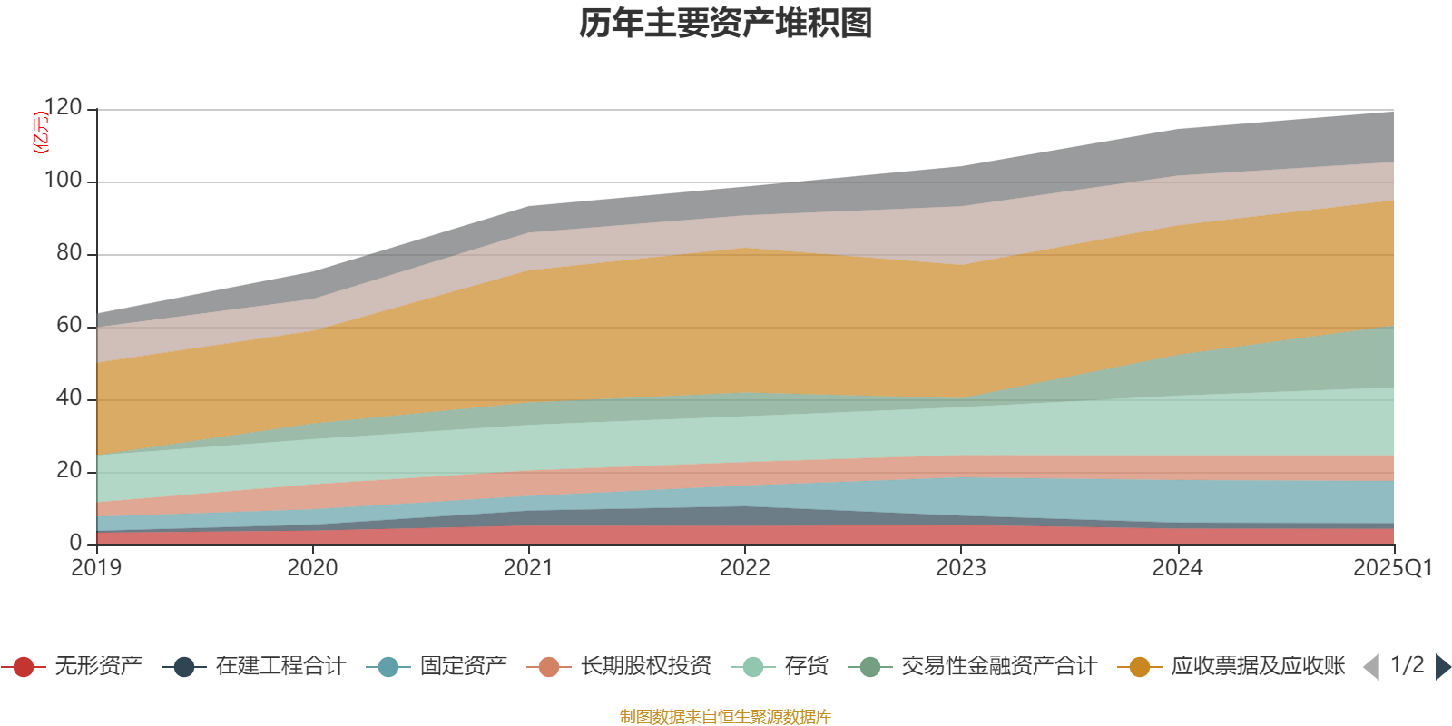 资产重大变化方面,截至2025年一季度末,公司交易性金融资产合计较上年末增加52.03%,占公司总资产比重上升4.51个百分点;货币资金较上年末减少23.08%,占公司总资产比重下降3.13个百分点;应收票据及应收账款较上年末减少3.35%,占公司总资产比重下降2.26个百分点;存货较上年末增加13.75%,占公司总资产比重上升1.32个百分点。