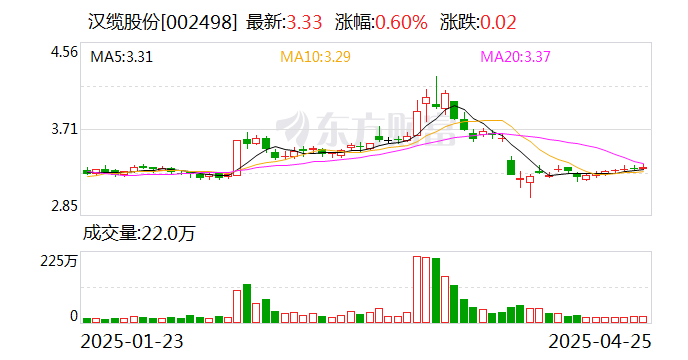 中证智能财讯汉缆股份(002498)4月28日披露2025年第一季度报告。公司实现营业总收入18.31亿元,同比增长2.51%;归母净利润1.43亿元,同比下降28.91%;扣非净利润1.25亿元,同比下降33.02%;经营活动产生的现金流量净额为4560.43万元,上年同期为-1.83亿元;报告期内,汉缆股份基本每股收益为0.043元,加权平均净资产收益率为1.73%。