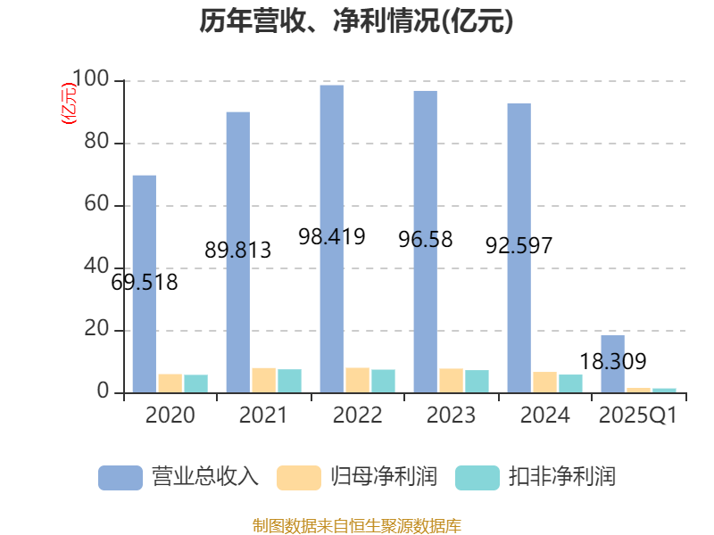 负债重大变化方面,截至2025年一季度末,公司短期借款较上年末增加18.95%,占公司总资产比重上升2.12个百分点;衍生金融负债较上年末减少98.93%,占公司总资产比重下降0.43个百分点;应付职工薪酬较上年末减少66.85%,占公司总资产比重下降0.42个百分点;应付票据及应付账款较上年末减少4.46%,占公司总资产比重下降0.39个百分点。