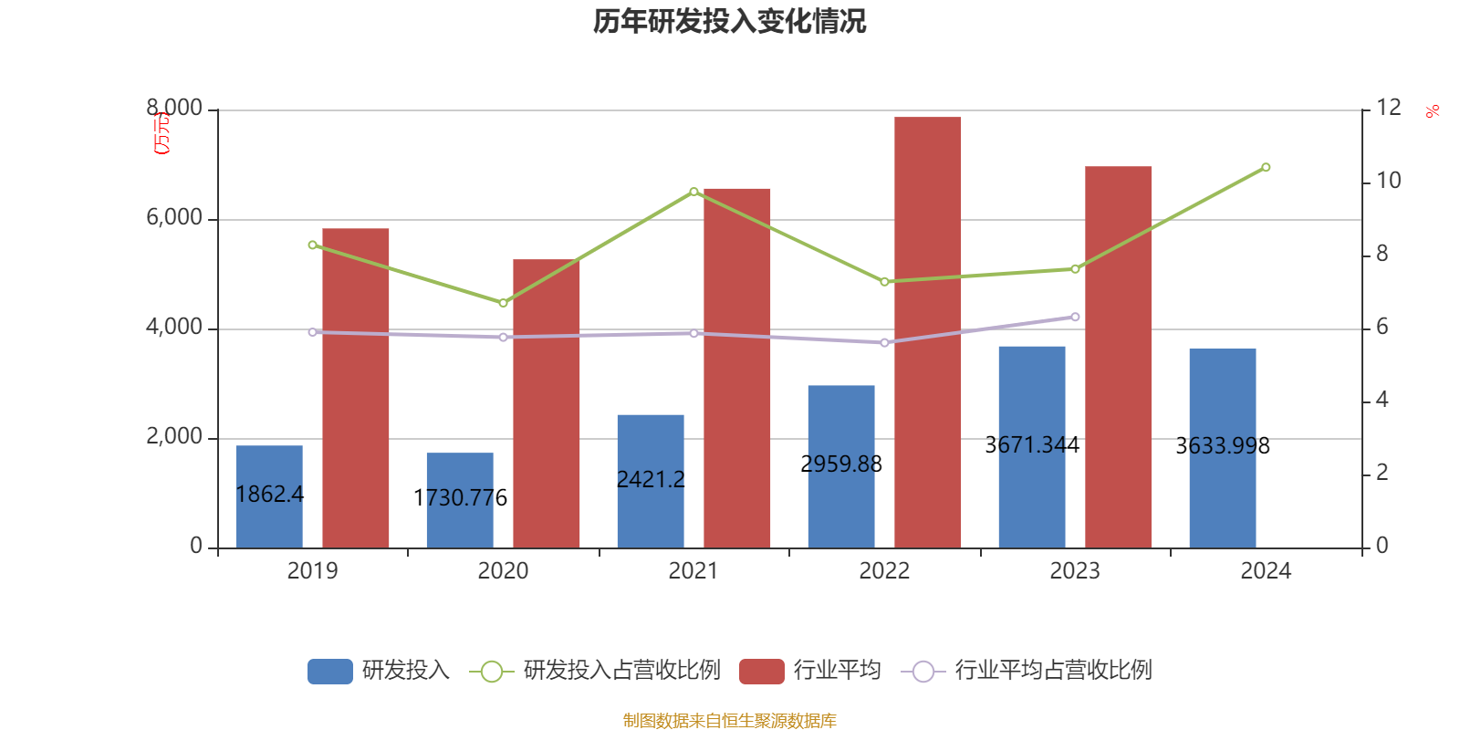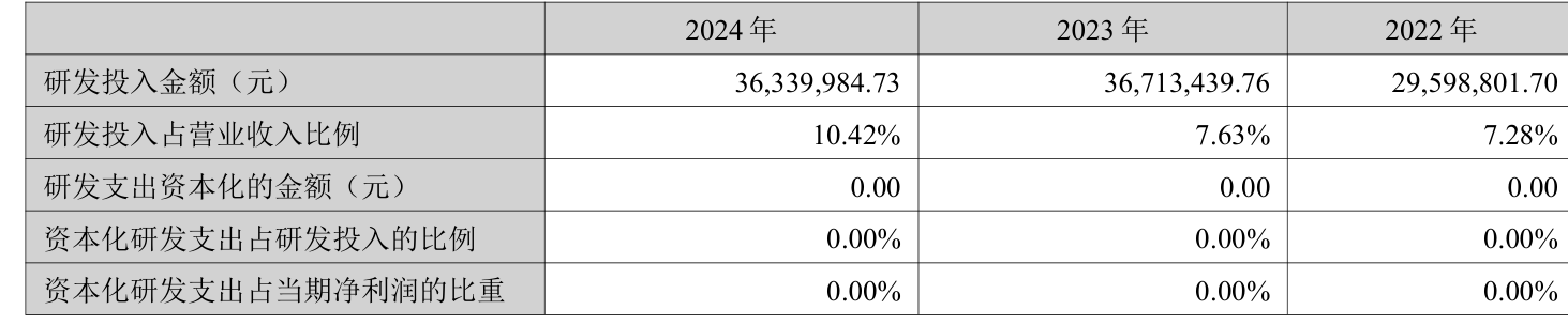 2024年全年,公司研发投入金额为3634万元,同比下降1.02%;研发投入占营业收入比例为10.42%,相比上年同期上升2.79个百分点。此外,公司全年研发投入资本化率为0%。