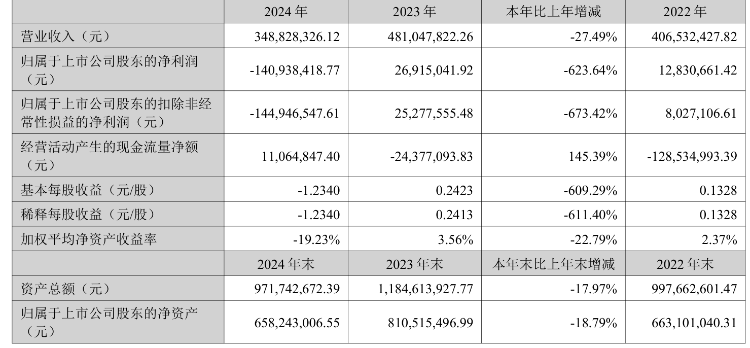 中证智能财讯三超新材(维权)(300554)4月28日披露2024年年度报告。2024年,公司实现营业总收入3.49亿元,同比下降27.49%;归母净利润亏损1.41亿元,上年同期盈利2691.5万元;扣非净利润亏损1.45亿元,上年同期盈利2527.76万元;经营活动产生的现金流量净额为1106.48万元,上年同期为-2437.71万元;报告期内,三超新材基本每股收益为-1.234元,加权平均净资产收益率为-19.23%。