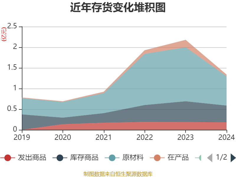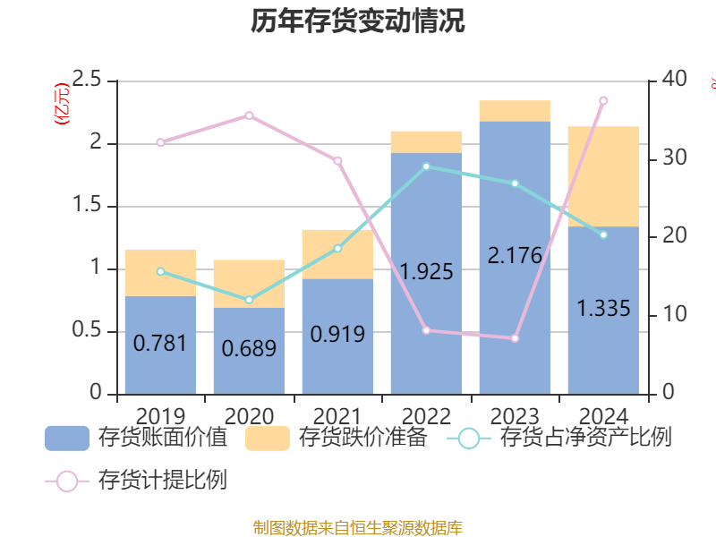 从存货变动来看,截至2024年末,公司存货账面价值为1.34亿元,占净资产的20.29%,较上年末减少8405.66万元。其中,存货跌价准备为7989.33万元,计提比例为37.43%。