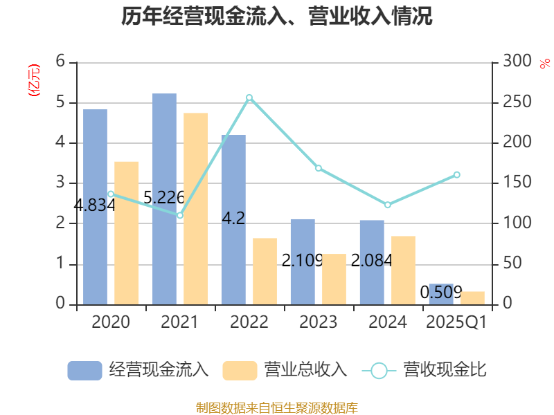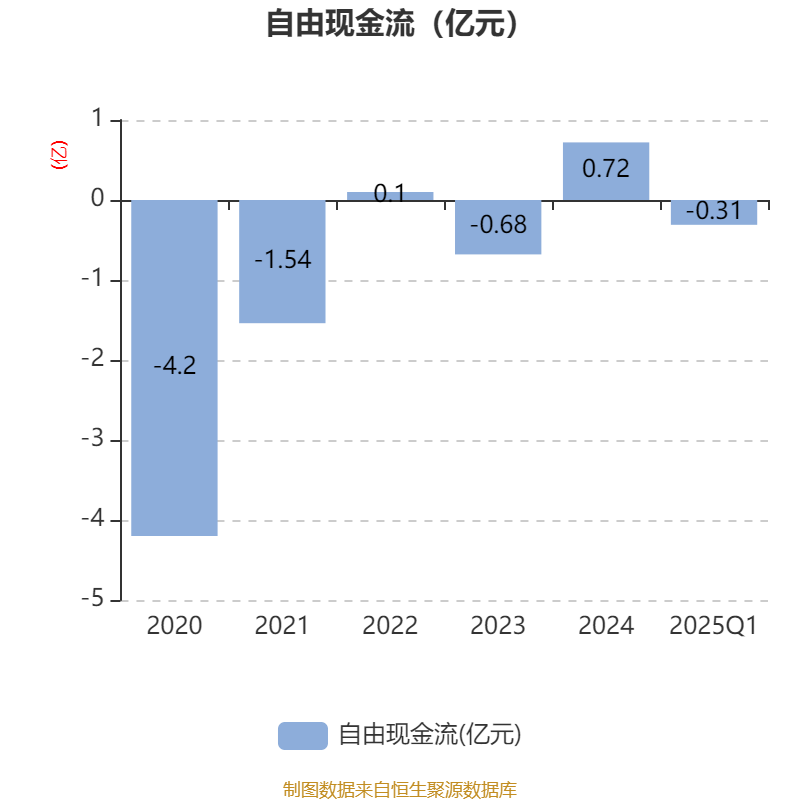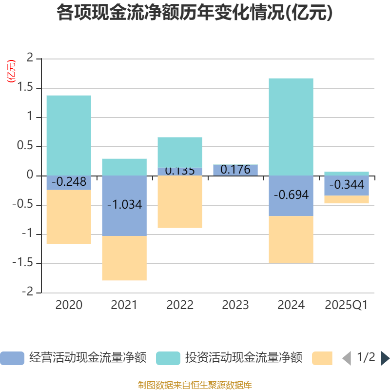 截至2025年一季度末,公司经营活动现金流净额为-3442.5万元,同比减少1332.85万元;筹资活动现金流净额-1318.69万元,同比减少2304.38万元;投资活动现金流净额654.06万元,上年同期为-153.83万元。