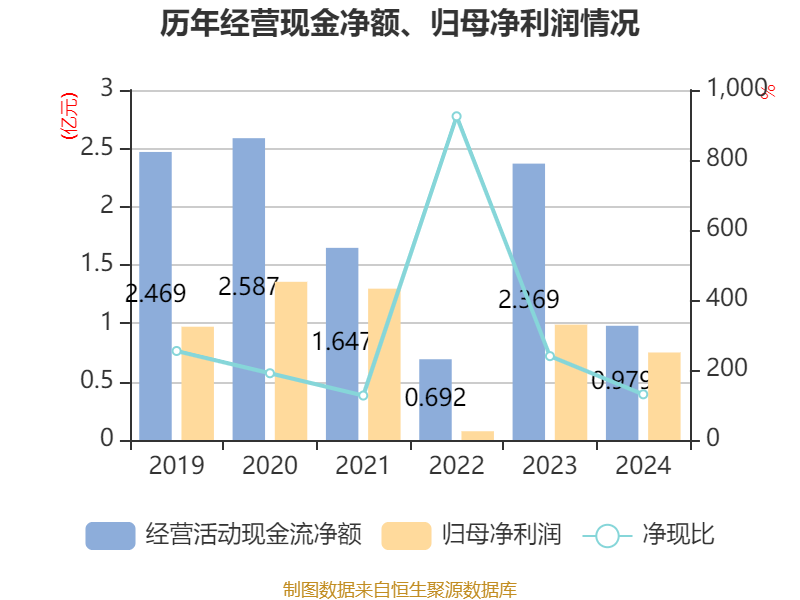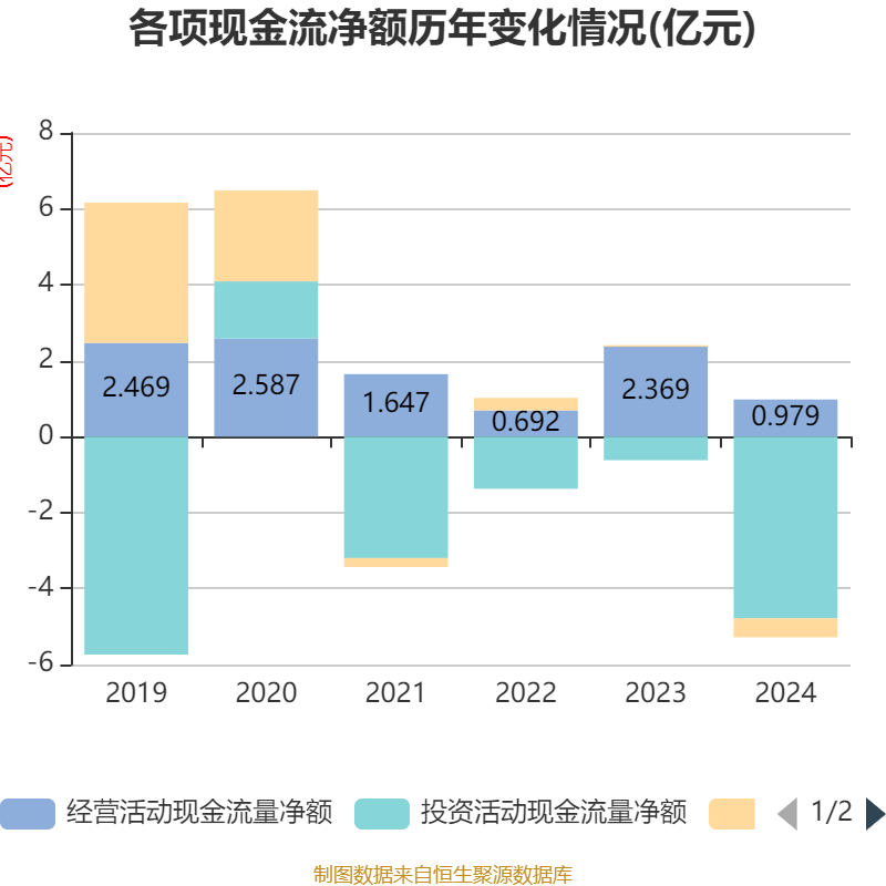截至2024年,公司经营活动现金流净额为9788.09万元,同比下降58.68%;筹资活动现金流净额-5022.72万元,同比减少5432.08万元;投资活动现金流净额-4.78亿元,上年同期为-6203.87万元。