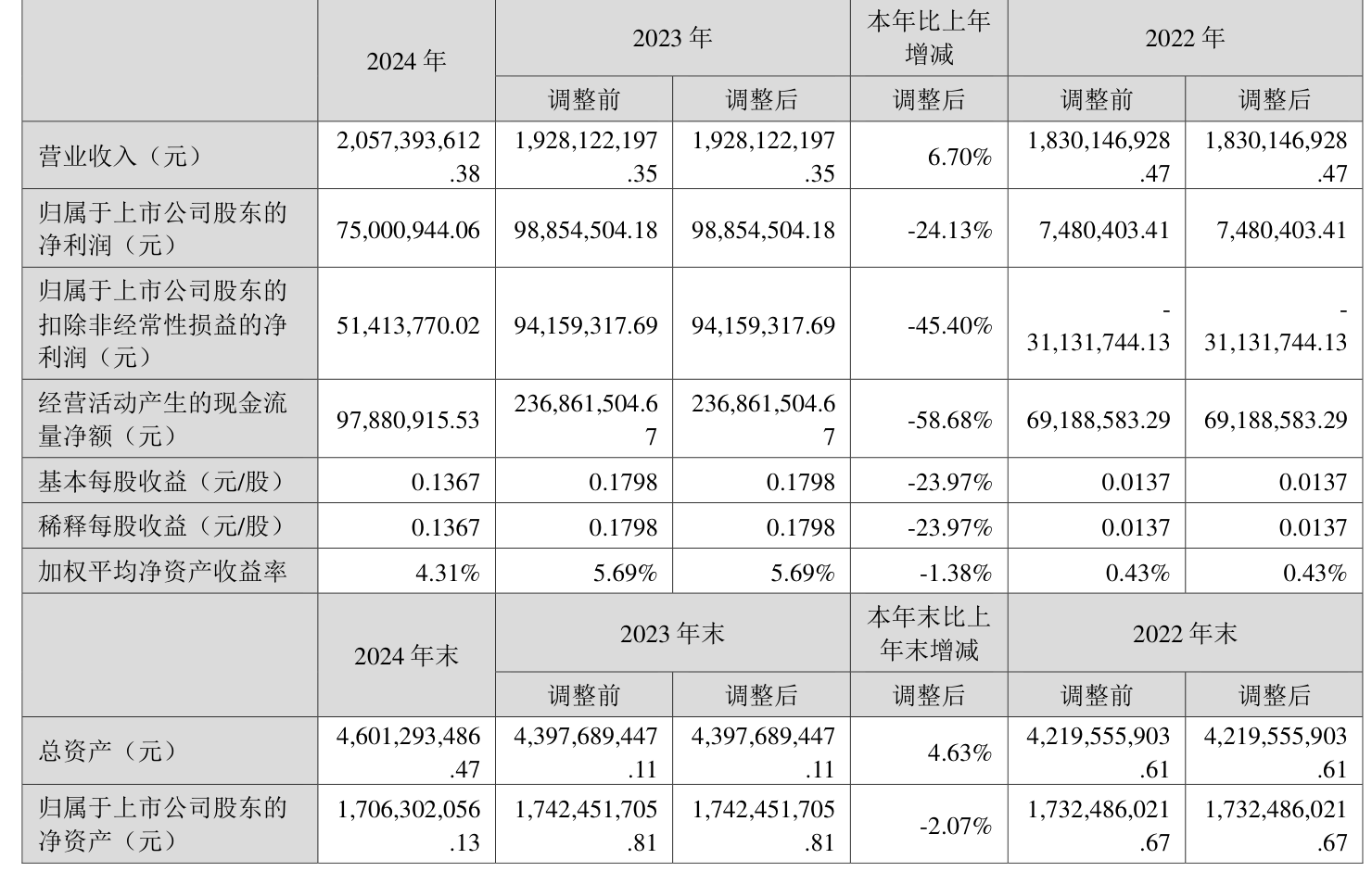中证智能财讯亚威股份(002559)4月28日披露2024年年度报告。2024年,公司实现营业总收入20.57亿元,同比增长6.70%;归母净利润7500.09万元,同比下降24.13%;扣非净利润5141.38万元,同比下降45.40%;经营活动产生的现金流量净额为9788.09万元,同比下降58.68%;报告期内,亚威股份基本每股收益为0.1367元,加权平均净资产收益率为4.31%。公司2024年度分配预案为:拟向全体股东每10股派现0.75元(含税)。