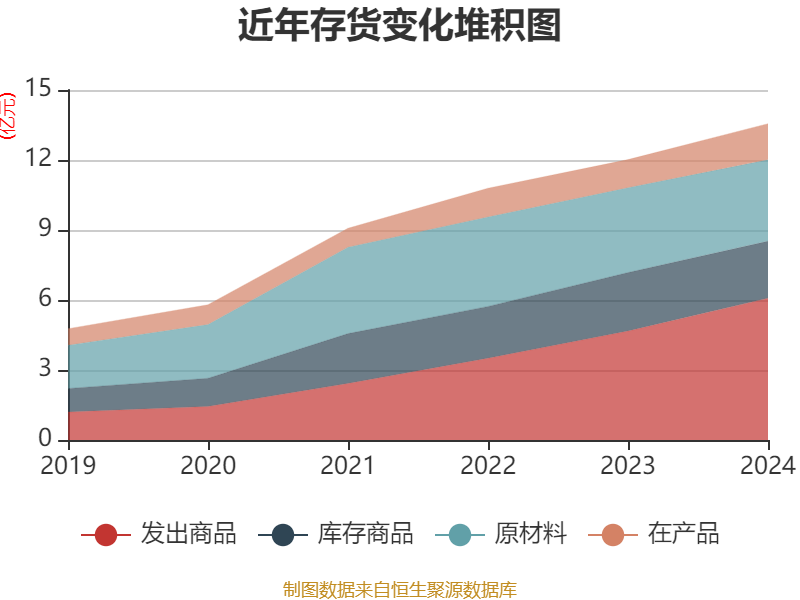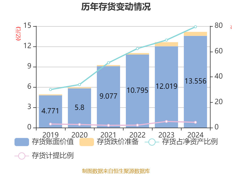 从存货变动来看,截至2024年末,公司存货账面价值为13.56亿元,占净资产的79.45%,较上年末增加1.54亿元。其中,存货跌价准备为5910.46万元,计提比例为4.18%。