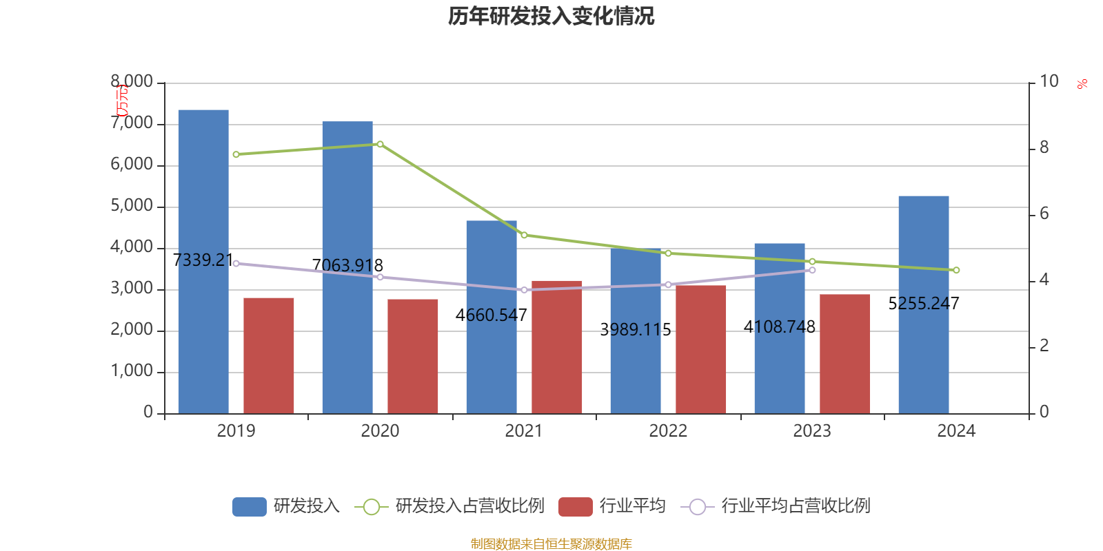 2024年全年,公司研发投入金额为5255.25万元,同比增长27.9%;研发投入占营业收入比例为4.33%,相比上年同期下降0.26个百分点。此外,公司全年研发投入资本化率为0%。