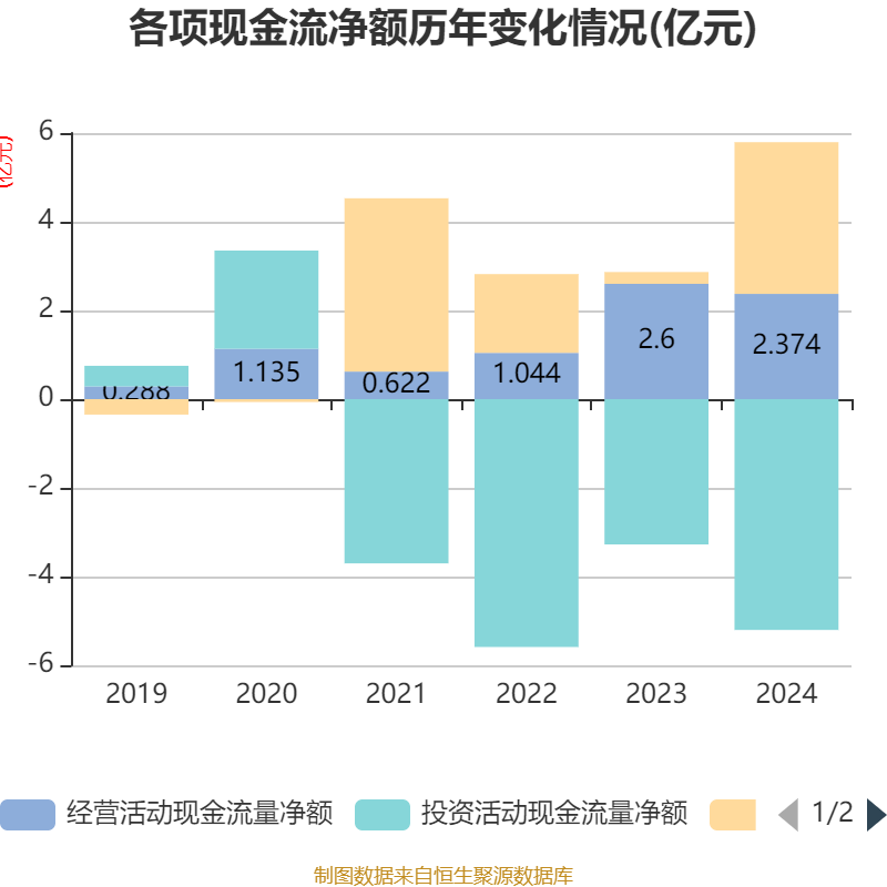 截至2024年,公司经营活动现金流净额为2.37亿元,同比下降8.72%;筹资活动现金流净额3.42亿元,同比增加3.15亿元;投资活动现金流净额-5.2亿元,上年同期为-3.28亿元。