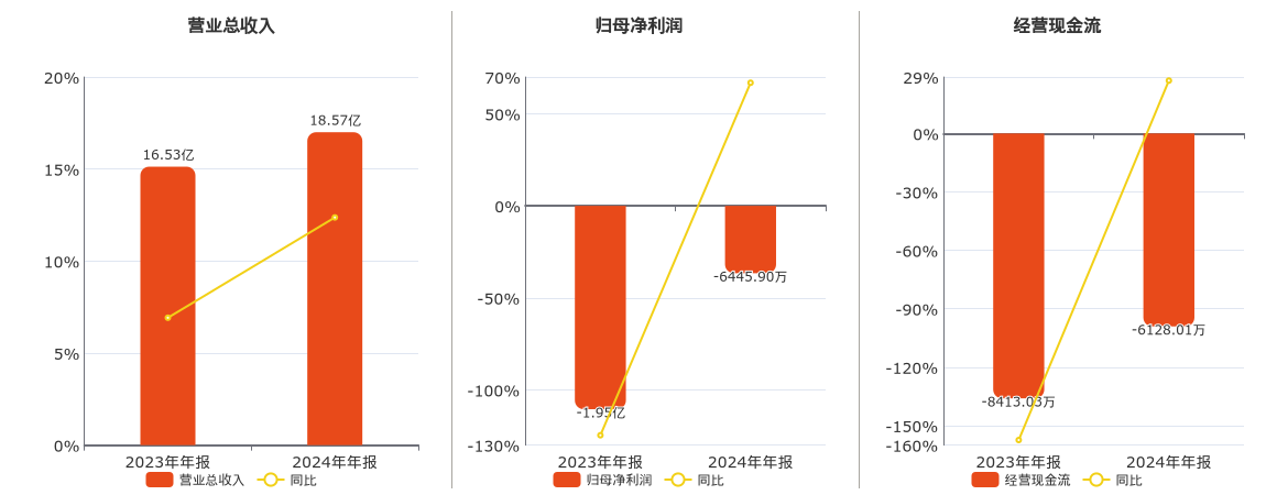公司营业总收入为18.57亿元。归母净利润为-6445.90万元,在已披露的同业公司中排名第63。经营活动现金净流入为-6128.01万元,在已披露的同业公司中排名第69。