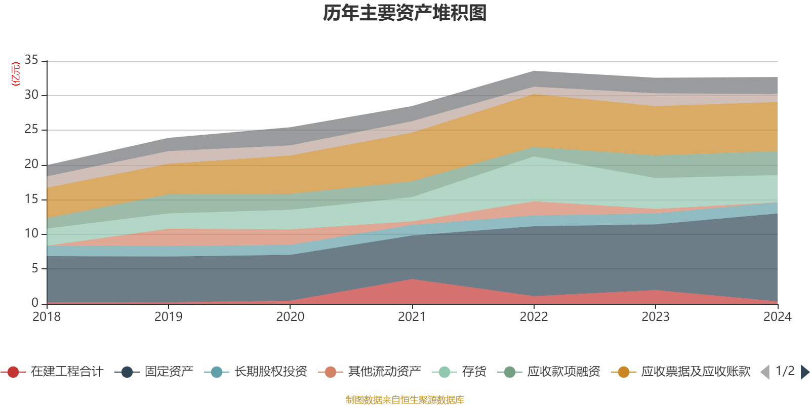 资产重大变化方面,截至2024年末,公司固定资产较上年末增加33.5%,占公司总资产比重上升9.63个百分点;在建工程合计较上年末减少82.1%,占公司总资产比重下降4.97个百分点;货币资金较上年末减少36.61%,占公司总资产比重下降2.09个百分点;其他流动资产较上年末减少100%,占公司总资产比重下降1.96个百分点。