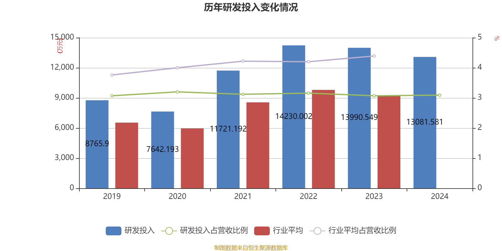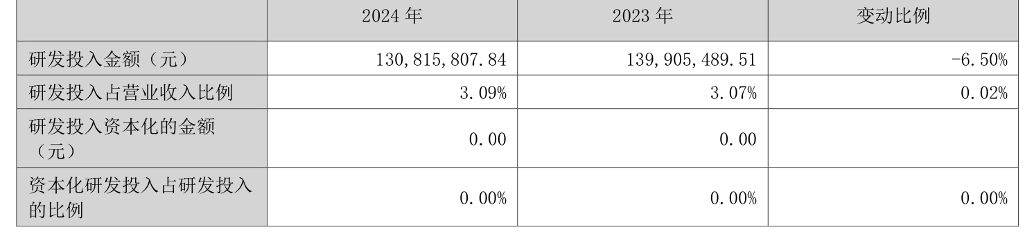 2024年全年,公司研发投入金额为1.31亿元,同比下降6.5%;研发投入占营业收入比例为3.09%,相比上年同期上升0.02个百分点。此外,公司全年研发投入资本化率为0%。