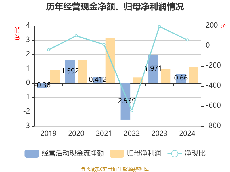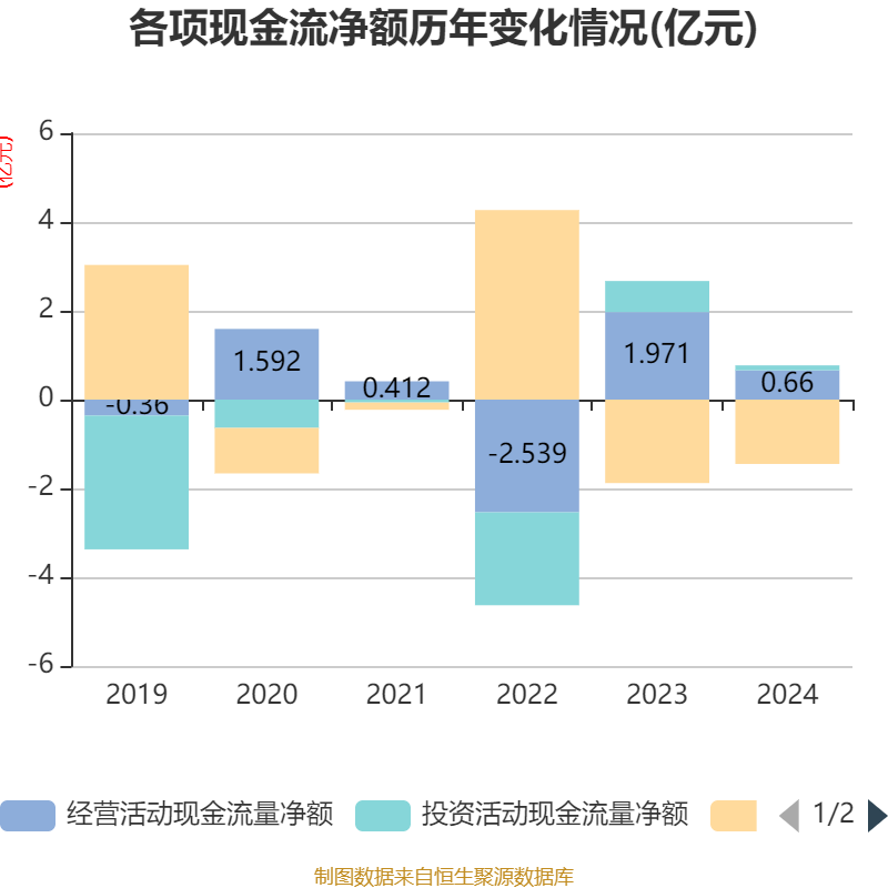 截至2024年,公司经营活动现金流净额为6601.3万元,同比下降66.51%;筹资活动现金流净额-1.45亿元,同比增加4305.3万元;投资活动现金流净额1107.07万元,上年同期为7003.06万元。