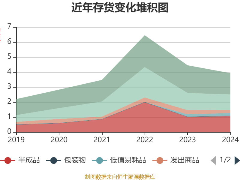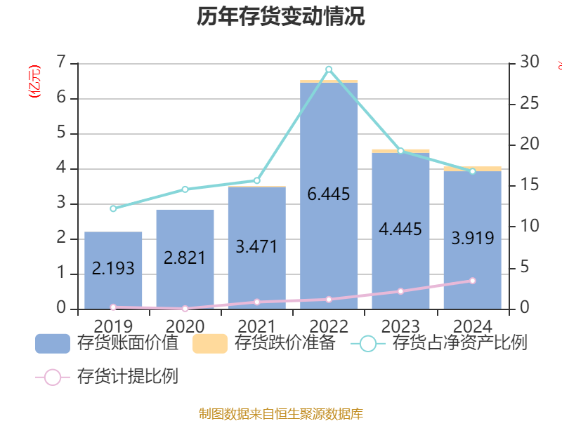 从存货变动来看,截至2024年末,公司存货账面价值为3.92亿元,占净资产的16.78%,较上年末减少5258.17万元。其中,存货跌价准备为1385.78万元,计提比例为3.42%。