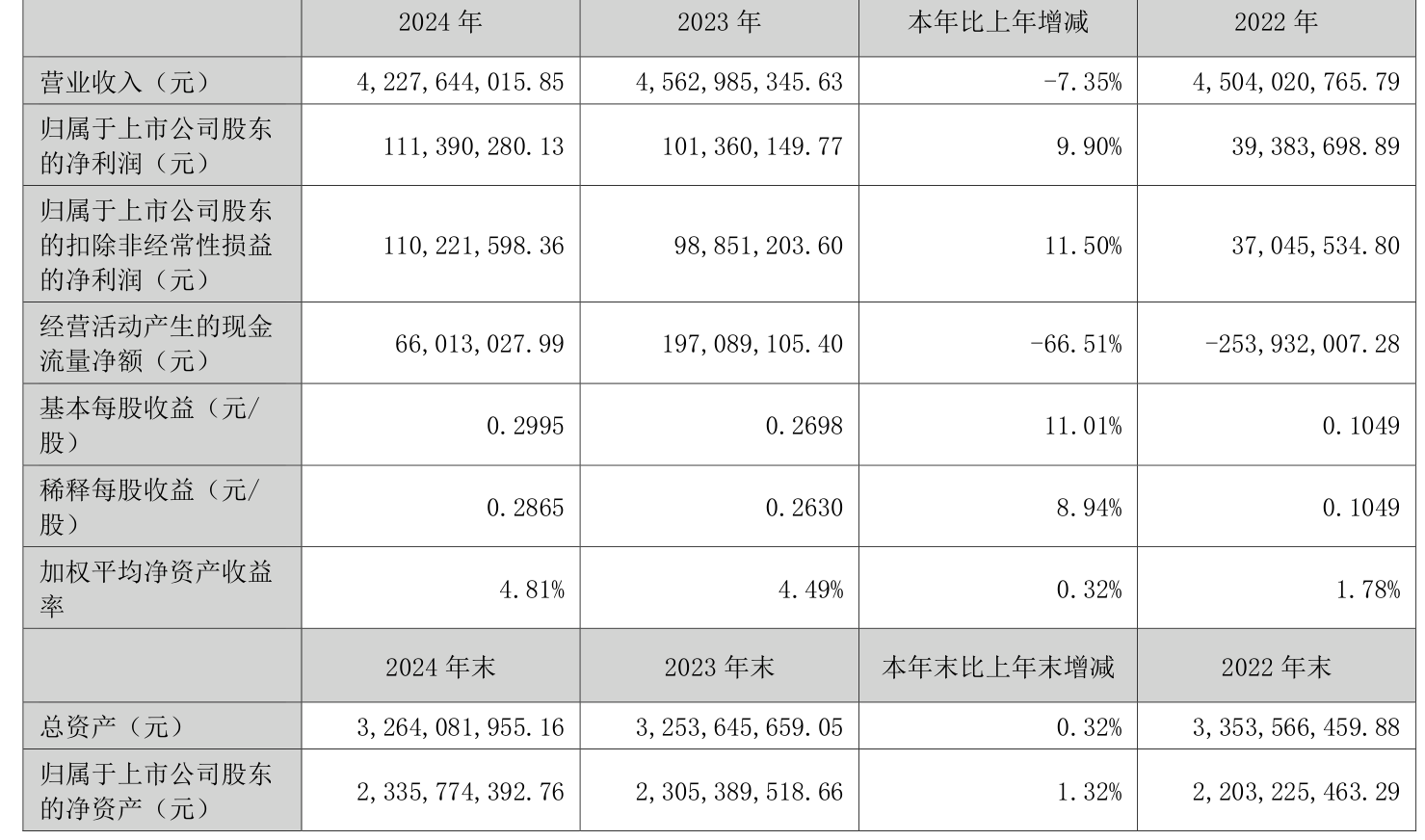 中证智能财讯永东股份(002753)4月26日披露2024年年度报告。2024年,公司实现营业总收入42.28亿元,同比下降7.35%;归母净利润1.11亿元,同比增长9.90%;扣非净利润1.1亿元,同比增长11.50%;经营活动产生的现金流量净额为6601.3万元,同比下降66.51%;报告期内,永东股份基本每股收益为0.2995元,加权平均净资产收益率为4.81%。公司2024年度分配预案为:拟向全体股东每10股派现1.5元(含税)。