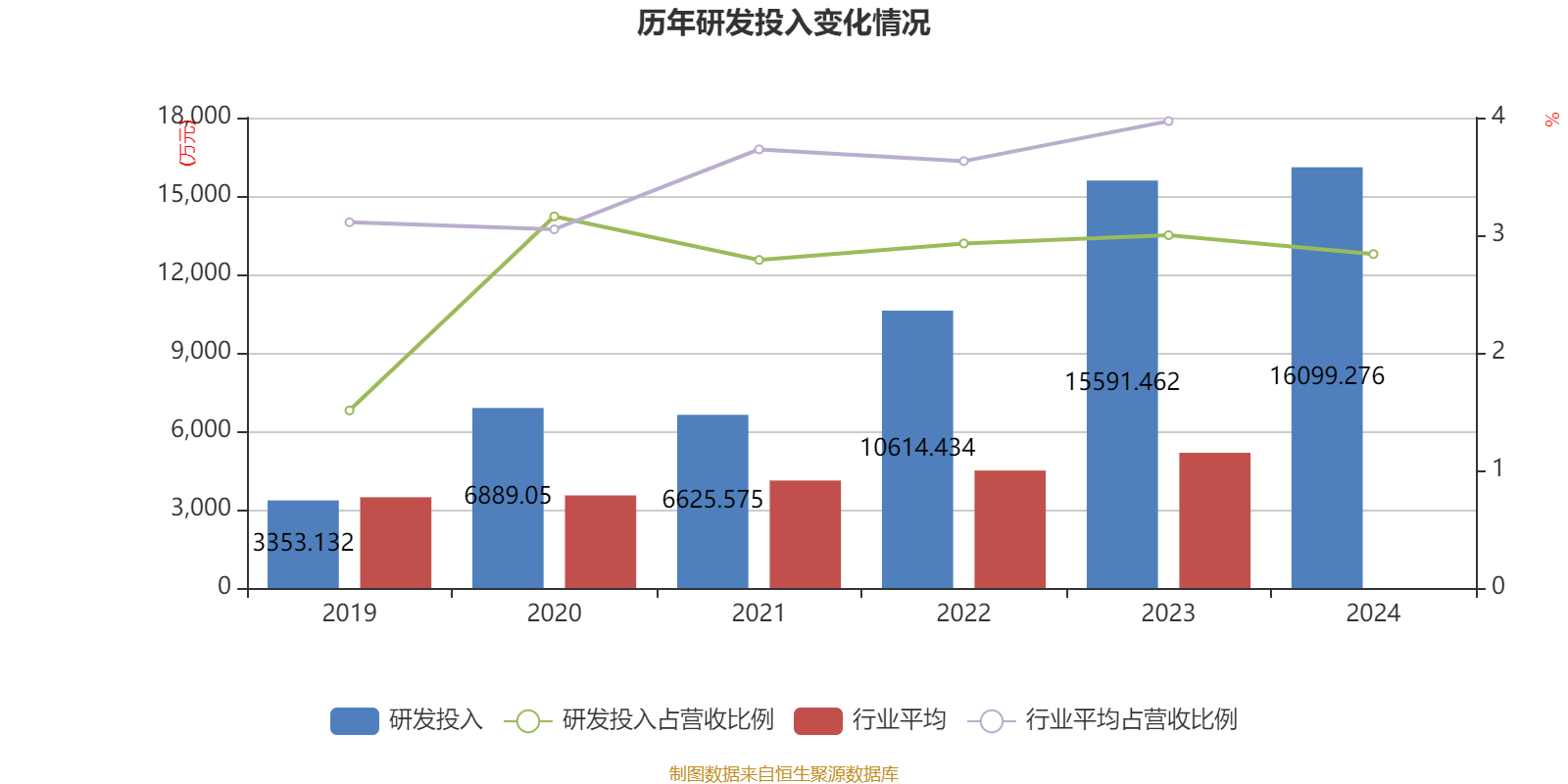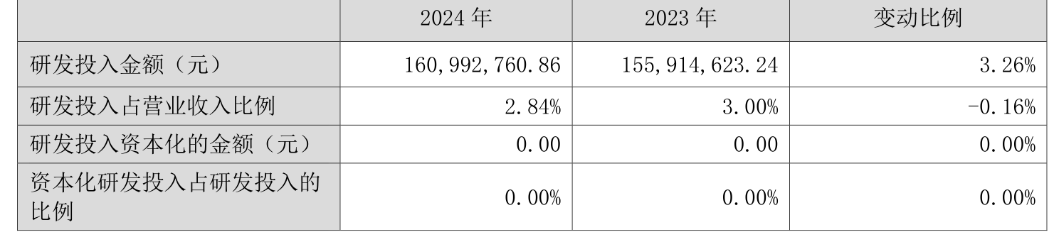 2024年全年,公司研发投入金额为1.61亿元,同比增长3.26%;研发投入占营业收入比例为2.84%,相比上年同期下降0.16个百分点。此外,公司全年研发投入资本化率为0%。