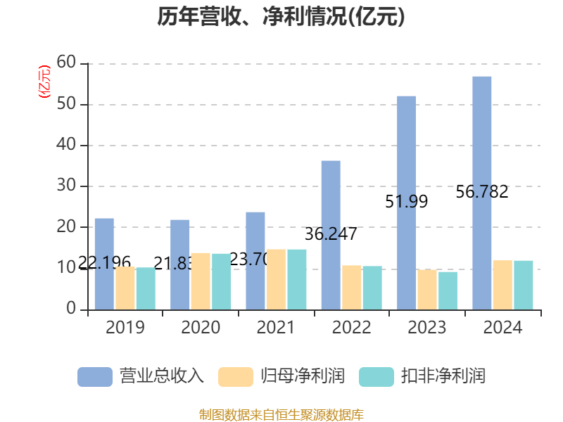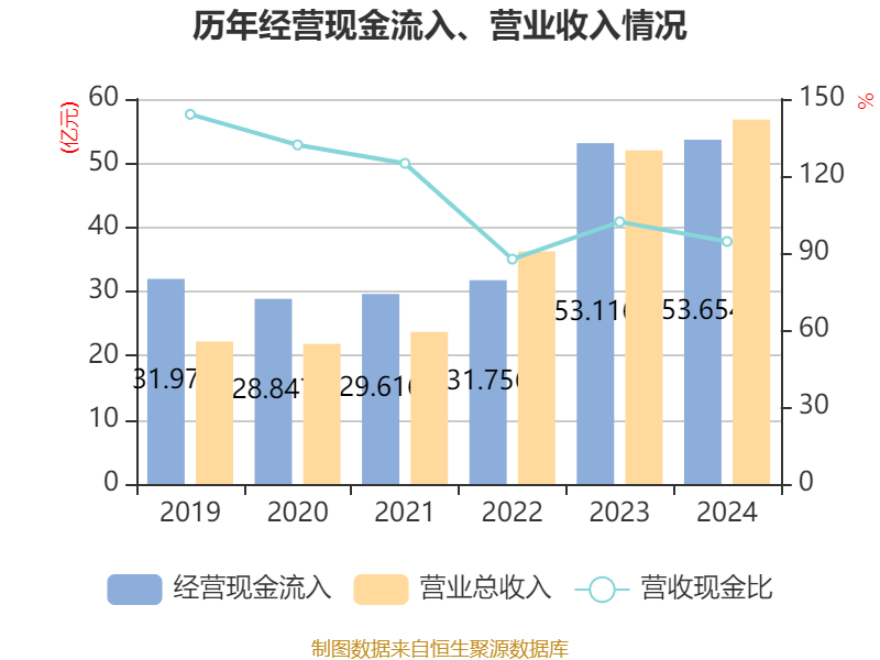 中证智能财讯中山公用(000685)4月26日披露2024年年度报告。2024年,公司实现营业总收入56.78亿元,同比增长9.22%;归母净利润11.99亿元,同比增长24.02%;扣非净利润11.88亿元,同比增长30.06%;经营活动产生的现金流量净额为-2.49亿元,上年同期为6.06亿元;报告期内,中山公用基本每股收益为0.82元,加权平均净资产收益率为7.08%。公司2024年度分配预案为:拟向全体股东每10股派现0.82元(含税)。