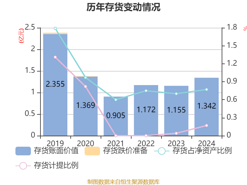 从存货变动来看,截至2024年末,公司存货账面价值为1.34亿元,占净资产的0.77%,较上年末增加1869.5万元。其中,存货跌价准备为22.95万元,计提比例为0.17%。