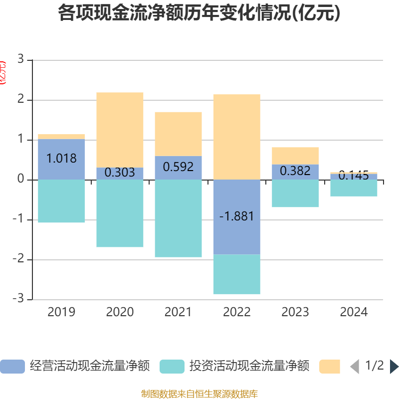 截至2024年,公司经营活动现金流净额为1451.35万元,同比下降62.05%;筹资活动现金流净额370.25万元,同比减少3900.3万元;投资活动现金流净额-4218.58万元,上年同期为-6902.56万元。