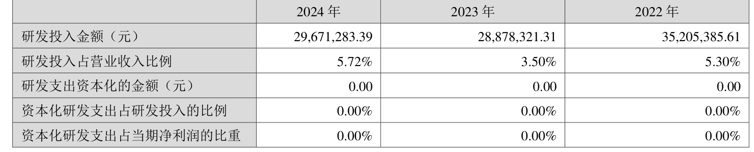 2024年全年,公司研发投入金额为2967.13万元,同比增长2.75%;研发投入占营业收入比例为5.72%,相比上年同期上升2.22个百分点。此外,公司全年研发投入资本化率为0%。