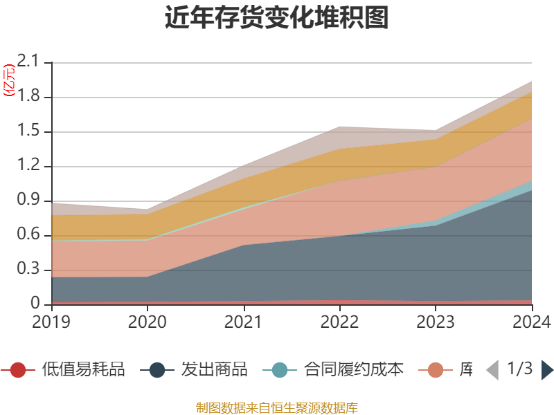 从存货变动来看,截至2024年末,公司存货账面价值为1.93亿元,占净资产的45.76%,较上年末增加4263.86万元。其中,存货跌价准备为373.94万元,计提比例为1.9%。
