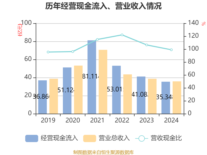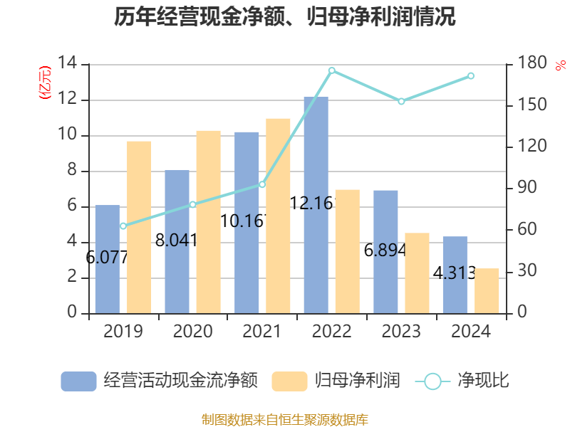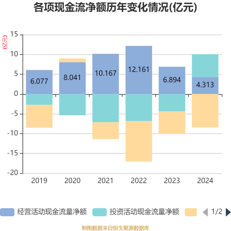 截至2024年,公司经营活动现金流净额为4.31亿元,同比下降37.44%;筹资活动现金流净额-8.44亿元,同比减少2.73亿元;投资活动现金流净额5.75亿元,上年同期为-4.37亿元。