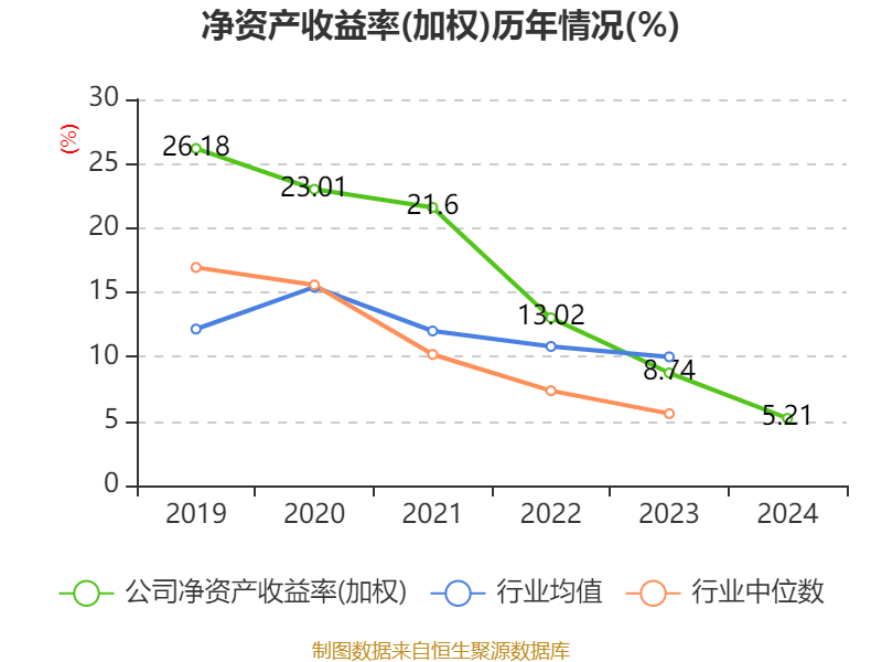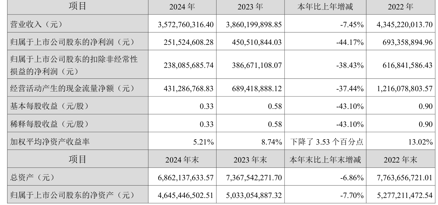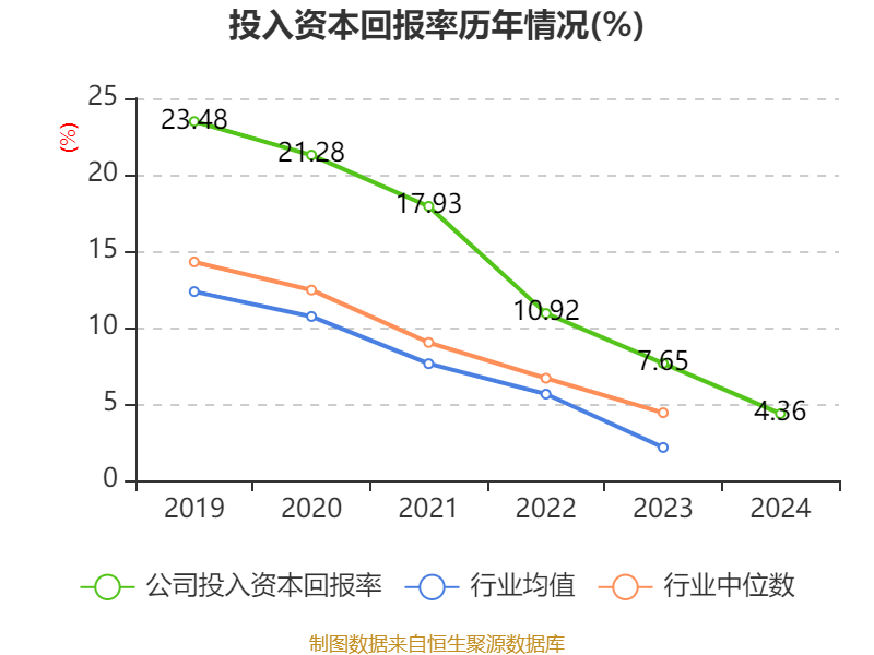 数据显示,2024年公司加权平均净资产收益率为5.21%,较上年同期下降3.53个百分点。公司2024年投入资本回报率为4.36%,较上年同期下降3.29个百分点。