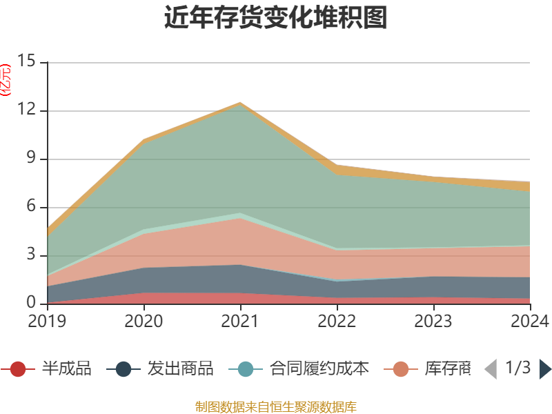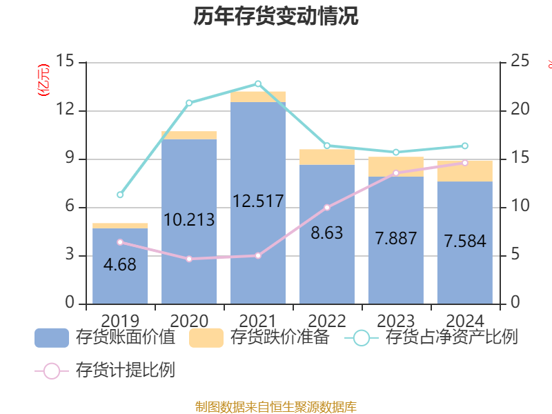 从存货变动来看,截至2024年末,公司存货账面价值为7.58亿元,占净资产的16.33%,较上年末减少3023.36万元。其中,存货跌价准备为1.29亿元,计提比例为14.57%。