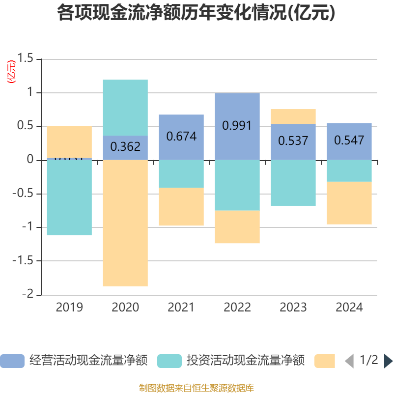 截至2024年,公司经营活动现金流净额为5472.09万元,同比增长1.88%;筹资活动现金流净额-6330.2万元,同比减少8517.05万元;投资活动现金流净额-3222.54万元,上年同期为-6800.66万元。