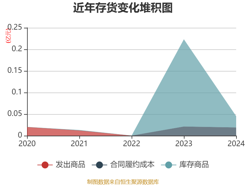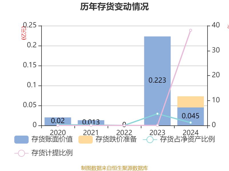 从存货变动来看,截至2024年末,公司存货账面价值为454.11万元,占净资产的1.12%,较上年末减少1778.68万元。其中,存货跌价准备为280.26万元,计提比例为38.16%。