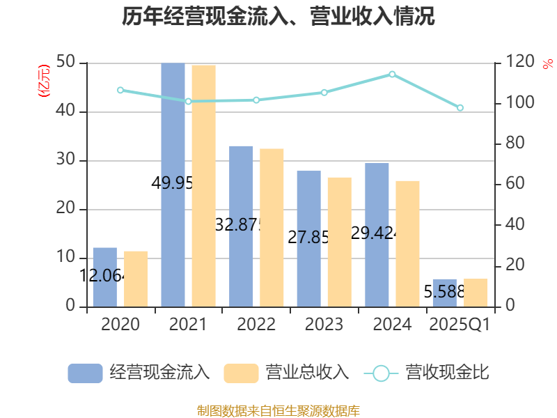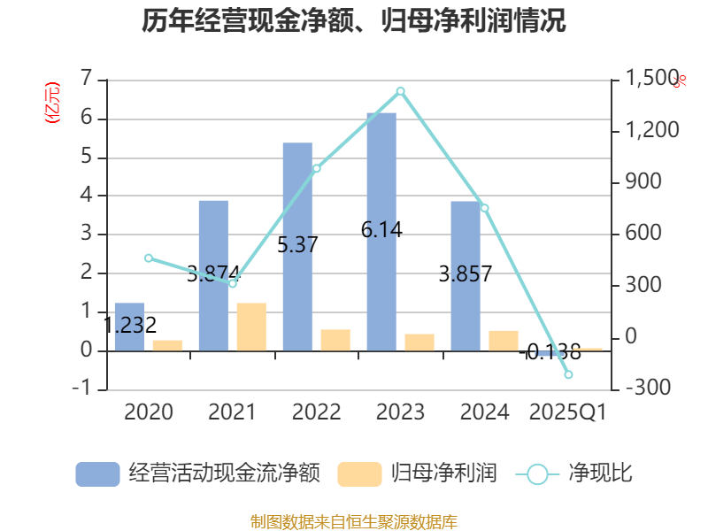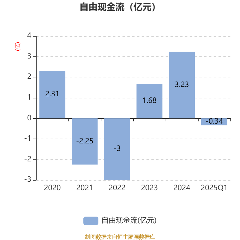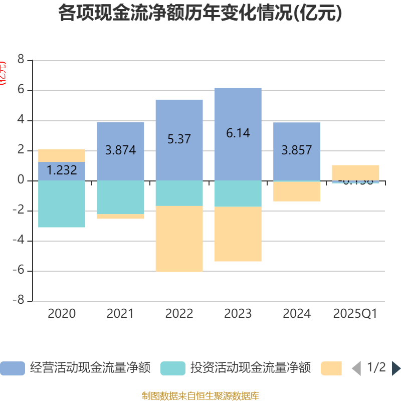 截至2025年一季度末,公司经营活动现金流净额为-1376.62万元,同比增加2401.51万元;筹资活动现金流净额1.01亿元,同比增加1.29亿元;投资活动现金流净额-559.34万元,上年同期为-367.11万元。