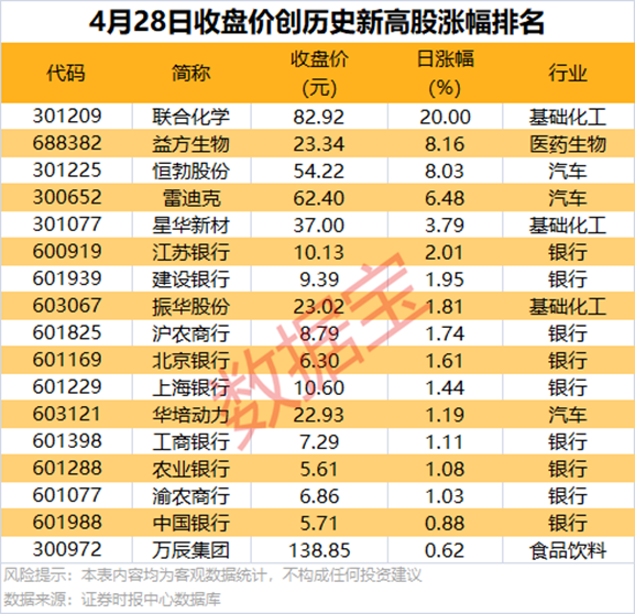 收盘价创历史新高股中,今日股价平均上涨3.70%,涨停的有联合化学等,涨幅居前的有益方生物、恒勃股份、雷迪克等。