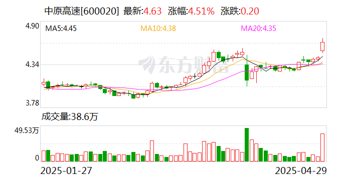 截至4月29日收盘,中原高速股价4.63元,市值达104亿元。今年以来,中原高速累计涨幅达9.72%,居高速公路上市公司首位。