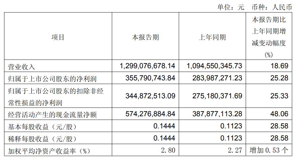 【大河财立方记者王磊彬】4月28日晚间,河南中原高速公路股份有限公司发布2025年第一季度报告,报告期内实现营业收入13亿元,同比增长18.69%;归属于上市公司股东的净利润3.56亿元,同比增长25.28%。基本每股收益0.1444元/股,同比增长28.58%。