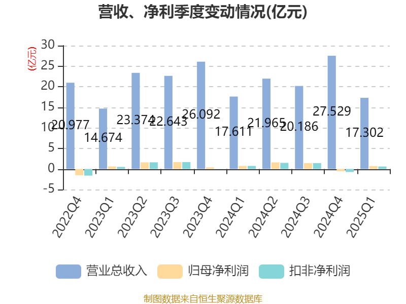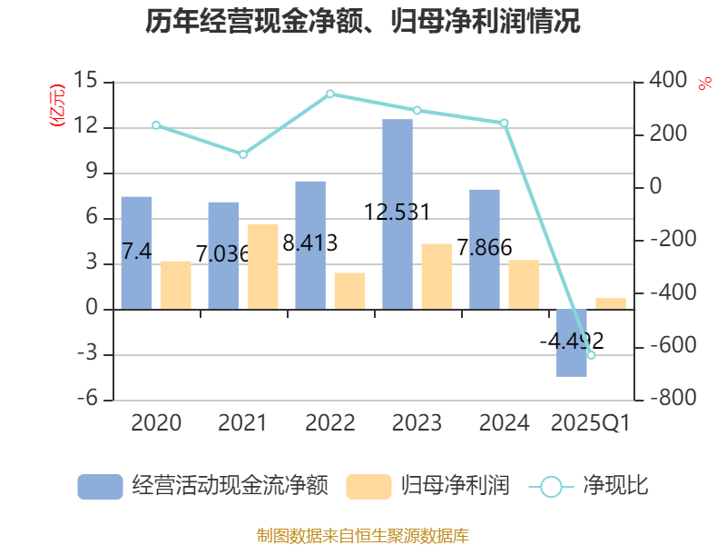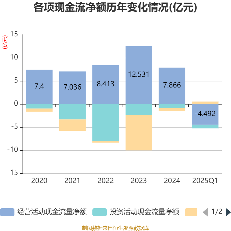 截至2025年一季度末,公司经营活动现金流净额为-4.49亿元,同比减少1.21亿元;筹资活动现金流净额5212.88万元,同比减少1.51亿元;投资活动现金流净额-7881.51万元,上年同期为-9071万元。