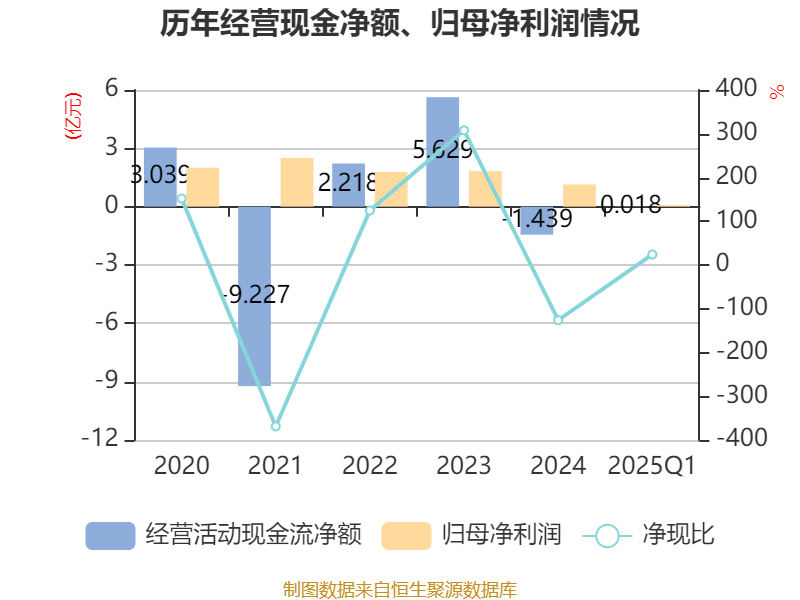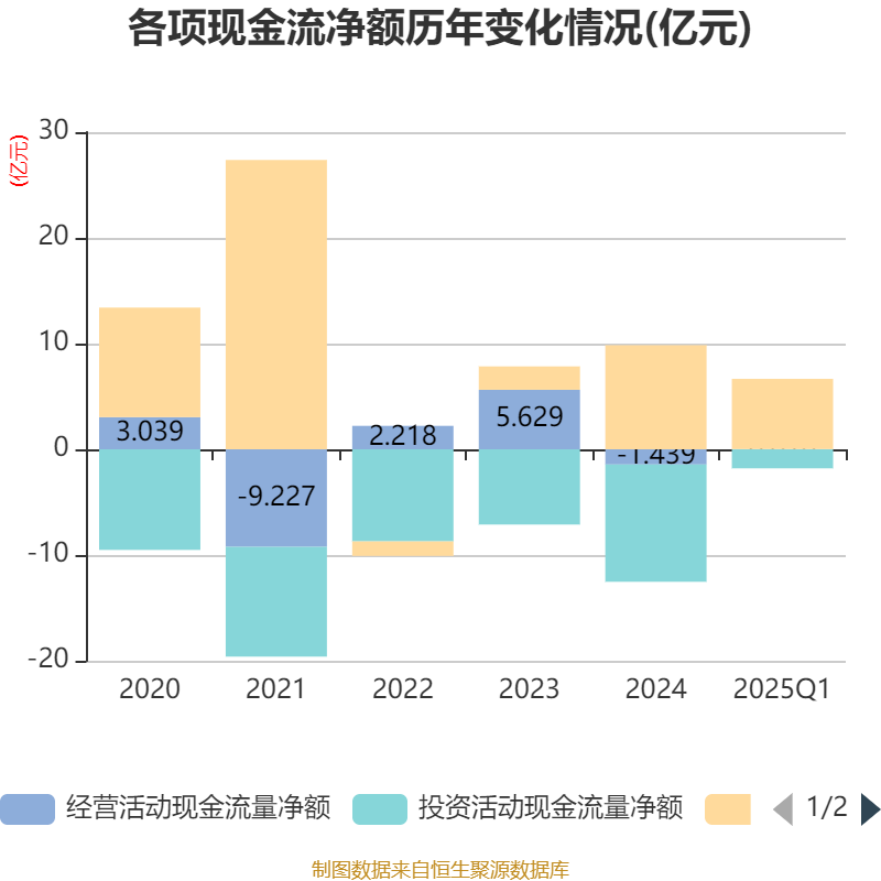 截至2025年一季度末,公司经营活动现金流净额为182.98万元,同比增长4.28%;筹资活动现金流净额6.65亿元,同比增加7.24亿元;投资活动现金流净额-1.8亿元,上年同期为-1.47亿元。