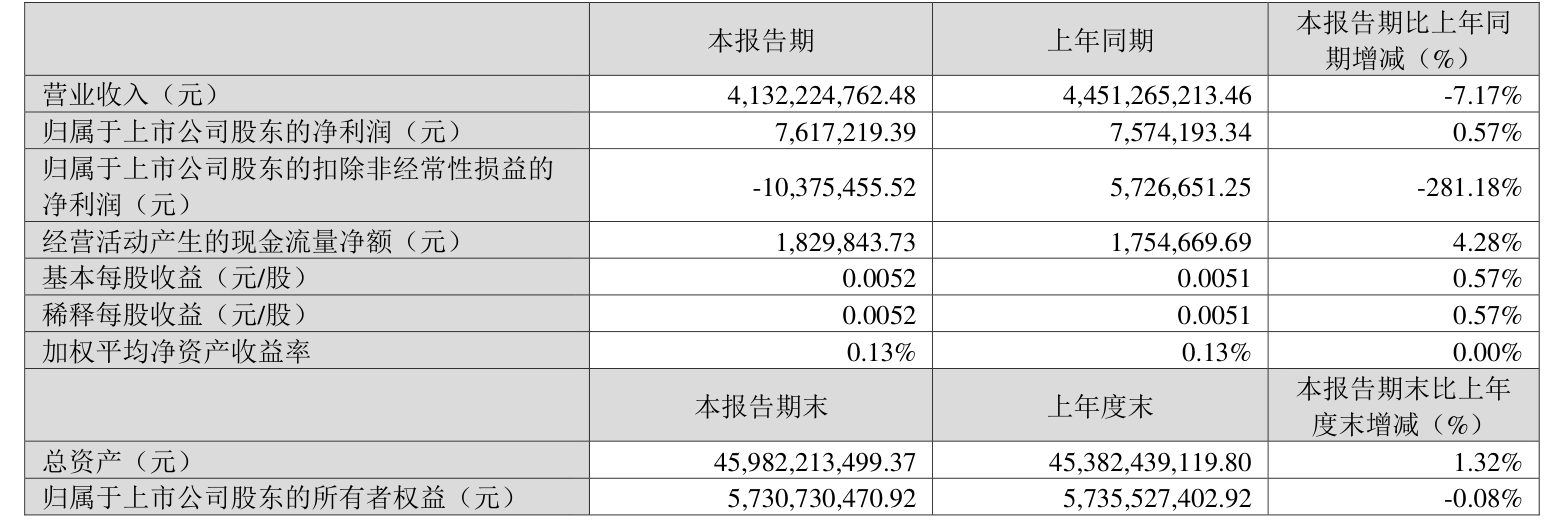 中证智能财讯泰达股份(000652)4月29日披露2025年第一季度报告。公司实现营业总收入41.32亿元,同比下降7.17%;归母净利润761.72万元,同比增长0.57%;扣非净利润亏损1037.55万元,上年同期盈利572.67万元;经营活动产生的现金流量净额为182.98万元,同比增长4.28%;报告期内,泰达股份基本每股收益为0.0052元,加权平均净资产收益率为0.13%。