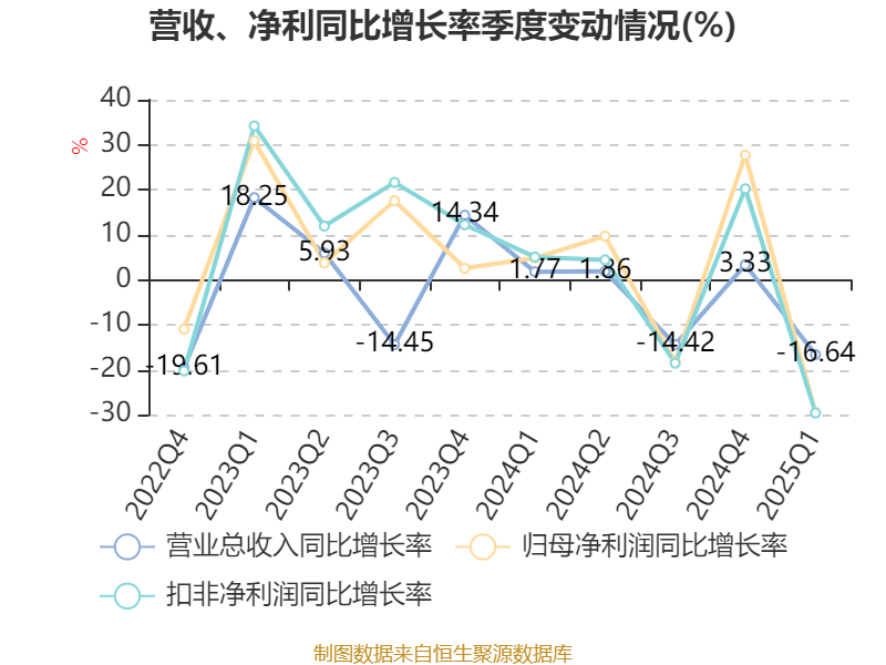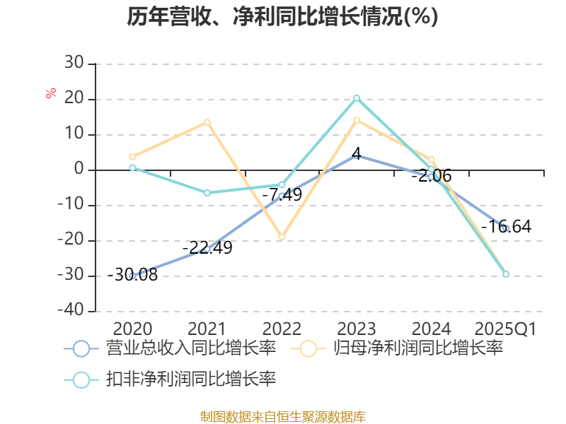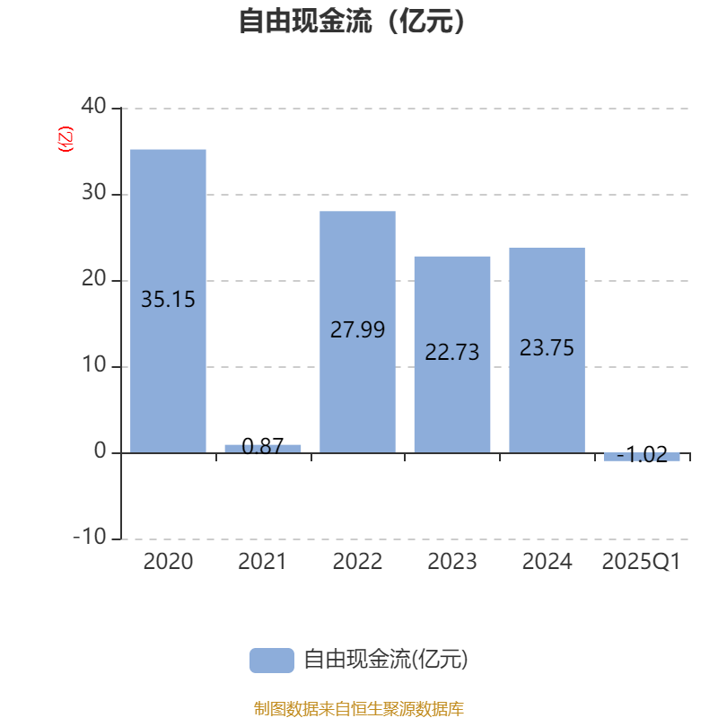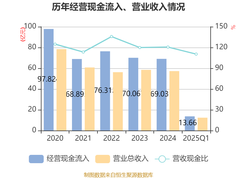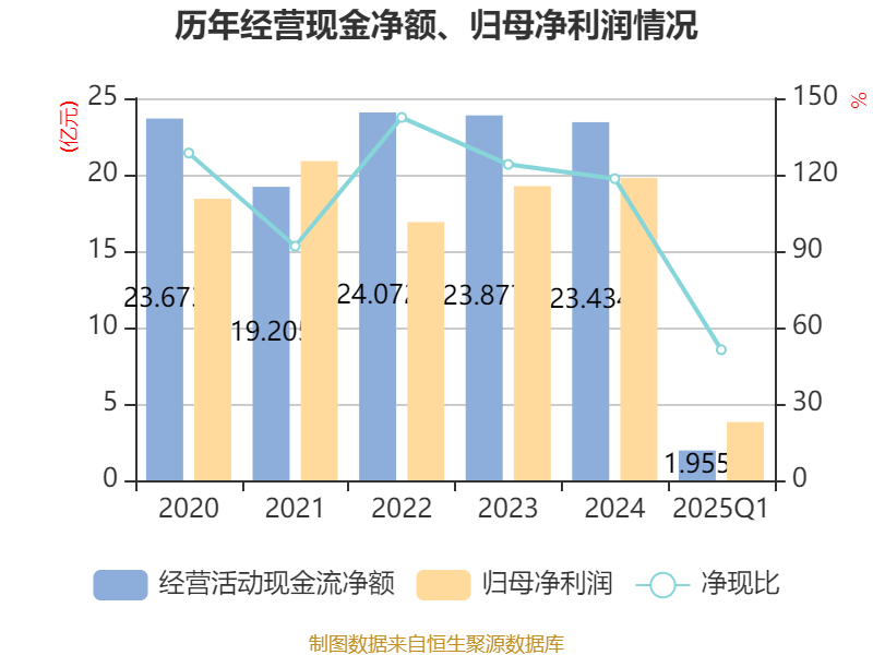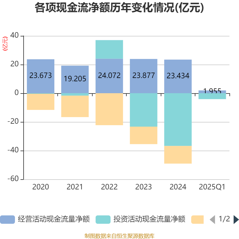 截至2025年一季度末,公司经营活动现金流净额为1.96亿元,同比下降69.99%;筹资活动现金流净额0元,与同期相比基本不变;投资活动现金流净额-4.13亿元,上年同期为-1.96亿元。