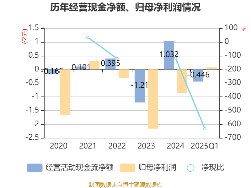 截至2025年一季度末,公司经营活动现金流净额为-4460.73万元,同比增加868.04万元;筹资活动现金流净额1.2亿元,同比增加1.44亿元;投资活动现金流净额-98.37万元,上年同期为-2.14万元。