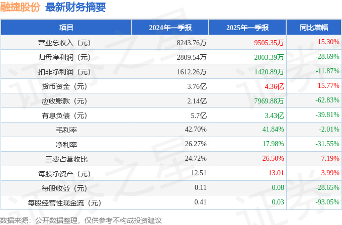 据证券之星公开数据整理,近期融捷股份(002192)发布2025年一季报。根据财报显示,融捷股份增收不增利。截至本报告期末,公司营业总收入9505.35万元,同比上升15.3%,归母净利润2003.39万元,同比下降28.69%。按单季度数据看,第一季度营业总收入9505.35万元,同比上升15.3%,第一季度归母净利润2003.39万元,同比下降28.69%。