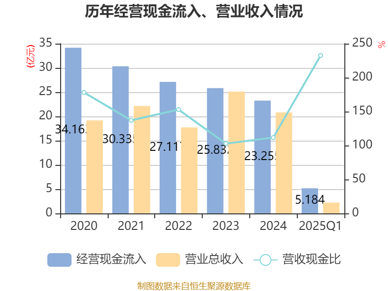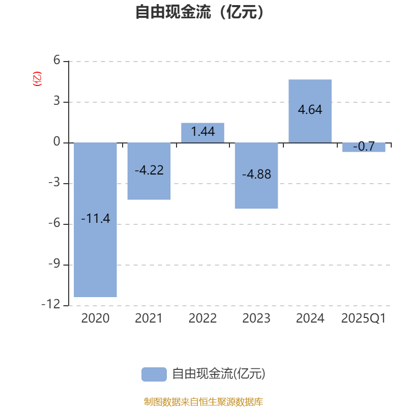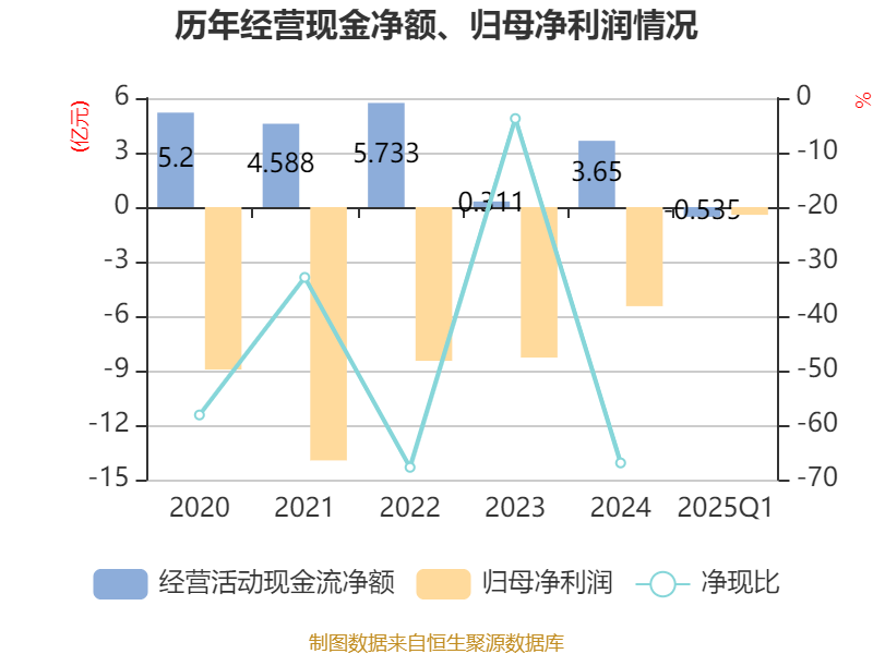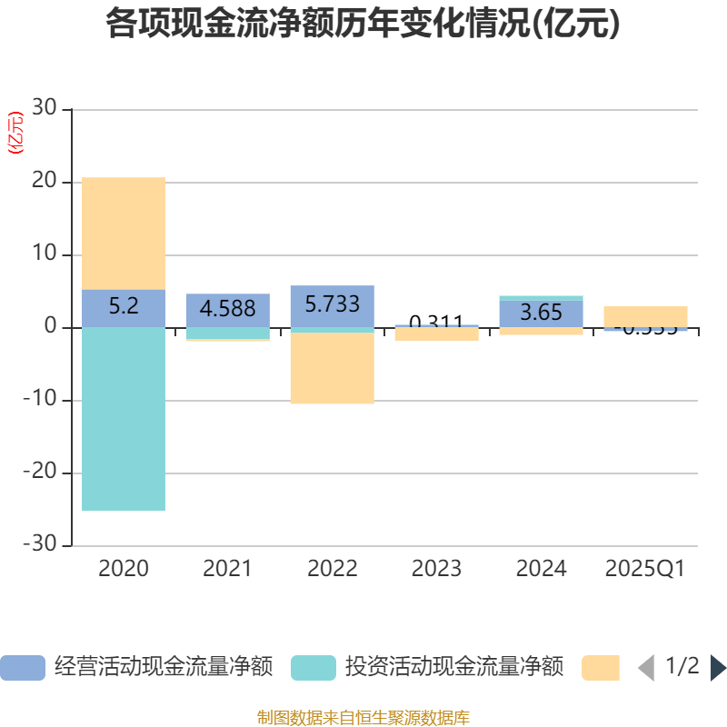 截至2025年一季度末,公司经营活动现金流净额为-5345.25万元,同比增加8321.64万元;筹资活动现金流净额2.87亿元,同比增加1.36亿元;投资活动现金流净额-158.84万元,上年同期为2231.94万元。